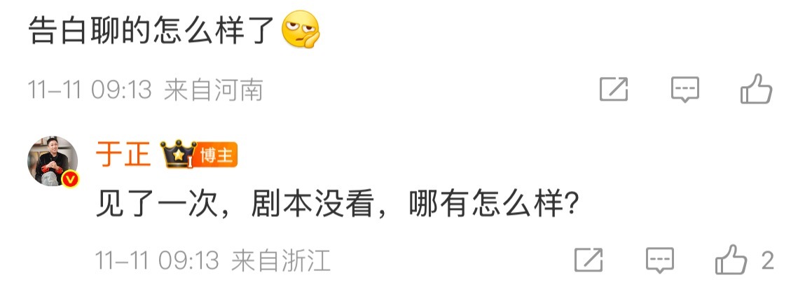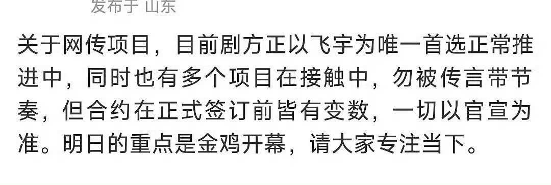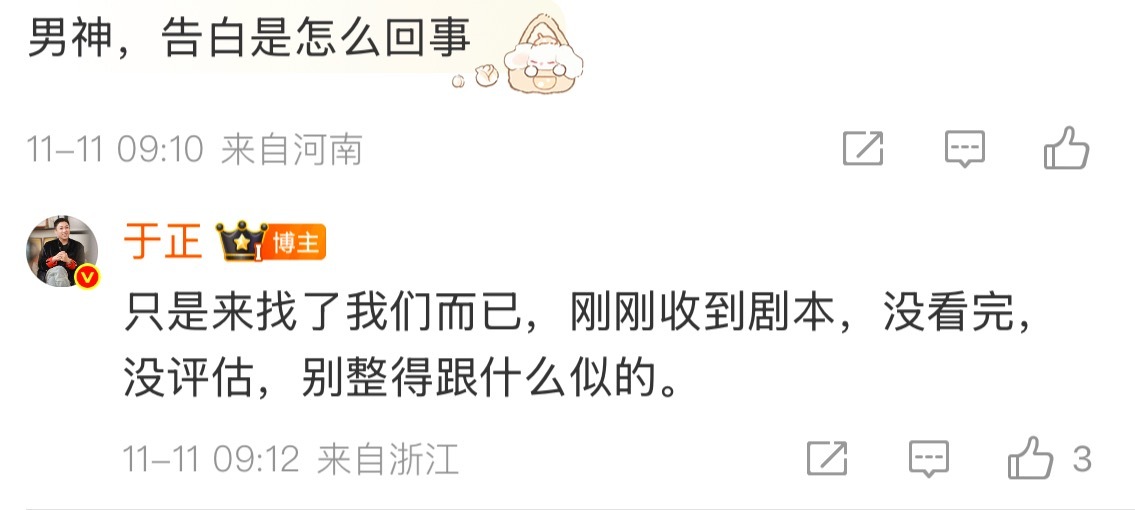 于正回应网友询问的《告白》相关:“只是来找了我们而已,刚刚收到剧本,没看完,没评估,别整得跟什么似的。”前情提要:昨天于正直播时说《告白》制片人找他想让王星越接《告白》,要聊一聊。网传的原定人选是陈飞宇,但昨天陆续有瓜主爆料男主换人。陈飞宇对接发文:“目前剧方正以飞宇为唯一首选正常推进中,同时也有多个项目在接触中,勿被传言带节奏,但合约在正式签订前皆有变数,一切以官宣为准。”