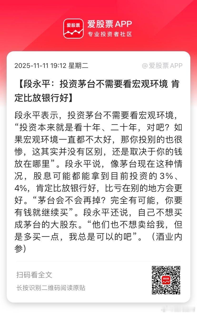 【段永平:投资茅台不需要看宏观环境 肯定比放银行好】段永平表示,投资茅台不需要看宏观环境,“投资本来就是看十年、二十年,对吧?如果宏观环境一直都不太好,那你投别的也很惨,这其实并没有区别,还是取决于你的钱放在哪里”。段永平说,像茅台现在这种情况,股息可能都能拿到目前投资的3%、4%,肯定比放银行好,比亏在别的地方会更好。“茅台会不会再掉?完全有可能,... 真滑稽
