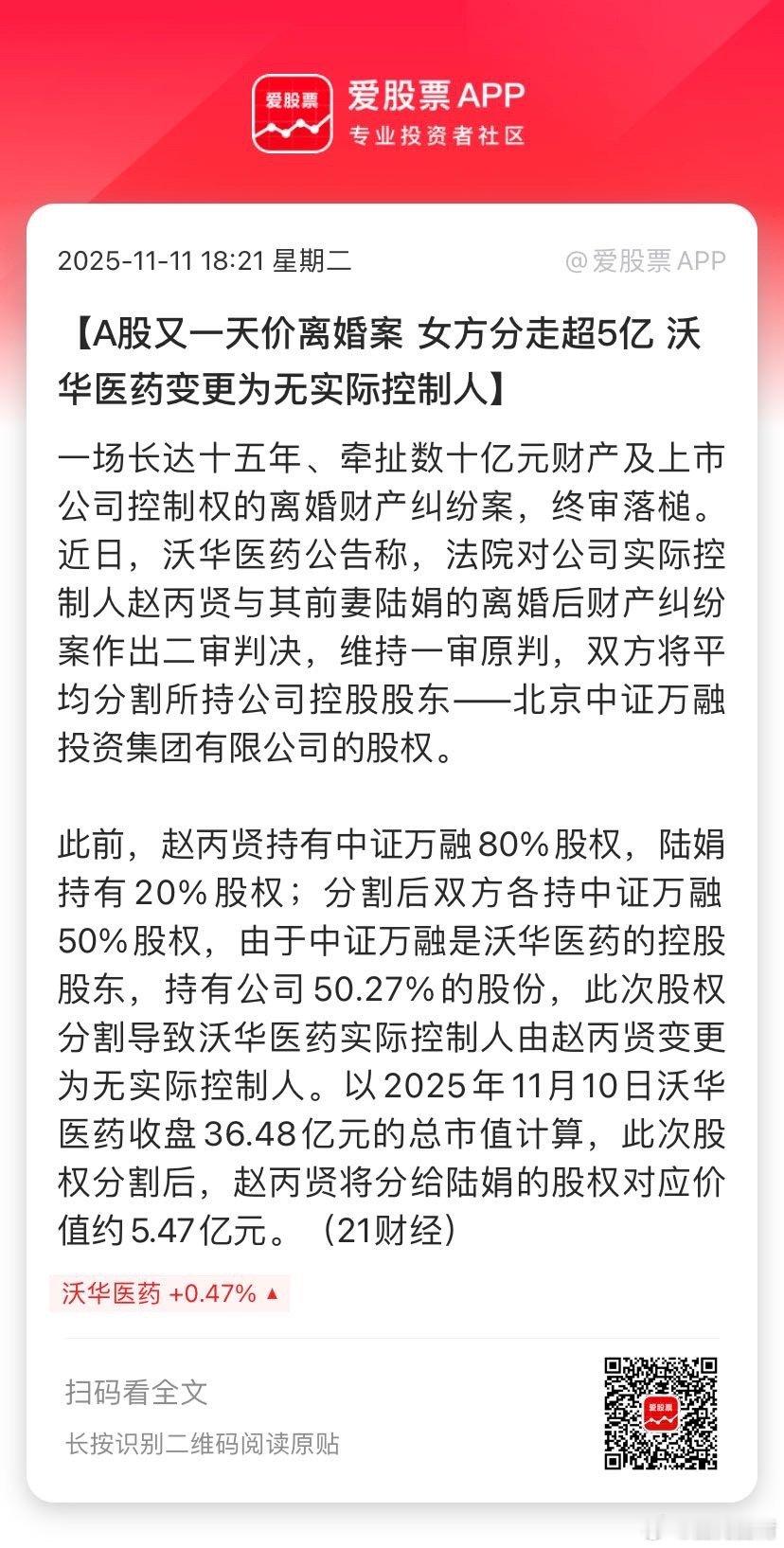 【A股又一天价离婚案 女方分走超5亿 沃华医药变更为无实际控制人】一场长达十五年、牵扯数十亿元财产及上市公司控制权的离婚财产纠纷案,终审落槌。近日,沃华医药公告称,法院对公司实际控制人赵丙贤与其前妻陆娟的离婚后财产纠纷案作出二审判决,维持一审原判,双方将平均分割所持公司控股股东——北京中证万融投资集团有限公司的股权。 此前,赵丙贤持有中证万融80%股权,陆娟... A股特色!