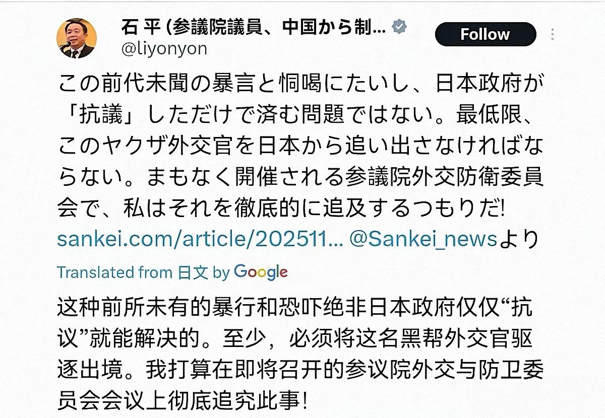 同样是在日本的中国人。 一个仗剑为国而战,一个已经不是人了(变成鬼子了)。 都说出去的人反起自身血脉来,比当地人更狠。这就是明证了! 就石平这样极端仇视母国的态度,在日本电视直播上,都被日本嘉宾直接开怼:“生在中国、长在中国,却背叛祖国”,其行为“不尊重自身血脉”,“背叛祖国的人终将失去尊重”。” 就这样,还对薛剑领事态度如此恶劣,上跳下窜得比日本人都积极。 人不做,偏偏做鬼!
