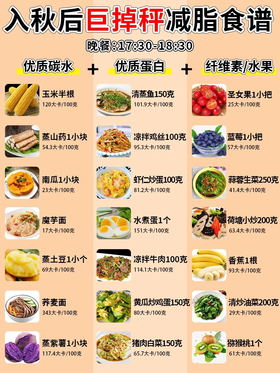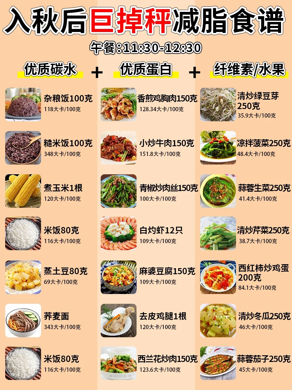 姐妹们,秋天到啦 又是一个减脂黄金期 今天给大家整理了一个入秋后的减脂食谱 真的有效‼️真的有效‼️真的有效‼️ 入秋后天气渐凉,这个时候容易进食高热量食物,有部分姐妹会出现食欲增大的现象,越是这个时候越需要控制调整饮食,要不冬天真的会成小肉球哦[暗中观察R][暗中观察R] 这个秋天不想长肉肉的姐妹,就根据食谱吃起来吧[派对R][派对R]