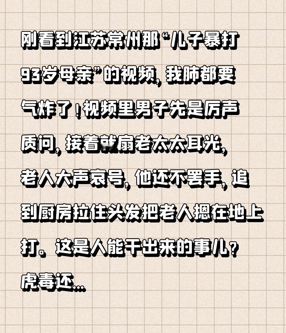 刚看到江苏常州那“儿子暴打93岁母亲”的视频,我肺都要气炸了!视频里男子先是厉声质问,接着就扇老太太耳光,老人大声哀号,他还不罢手,追到厨房拉住头发把老人摁在地上打。这是人能干出来的事儿?虎毒还不食子呢,他倒好,对自己亲妈下这么狠的手。 好在官方通报,这叫杨某中的男子已被抓获,案子正在侦办。妇联和派出所也上门服务了,希望老人能得到妥善照顾。真希望法律严惩这种不孝子,让他为自己的恶行付出代价!