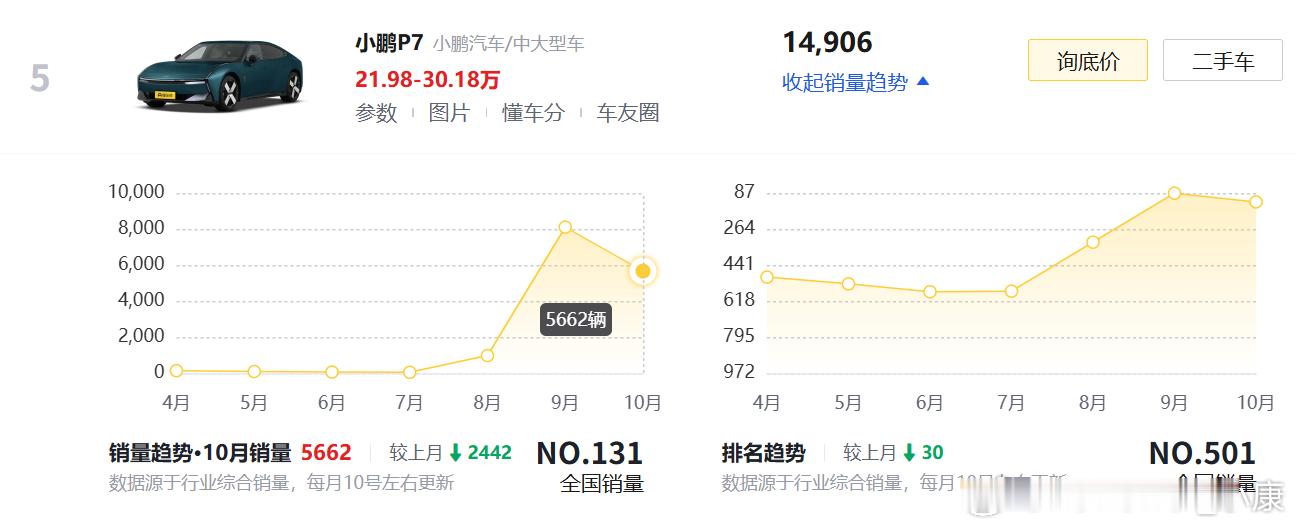 小鹏新P7销量,9月卖了8104辆,10月卖了5662辆。是价格不够便宜,还是外