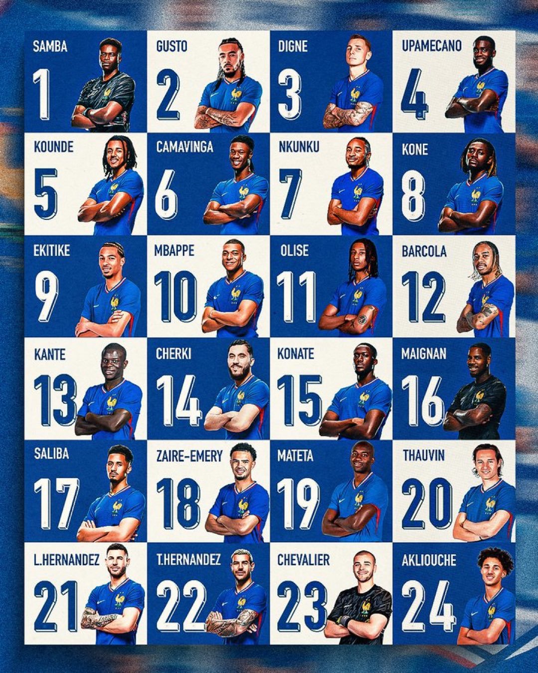 【官方】 法国国家队公布此次 欧洲区预选赛球员球衣号码:🔴⚫️迈尼昂🇫🇷 1️⃣6️⃣号恩昆库🇫🇷 7️⃣号.