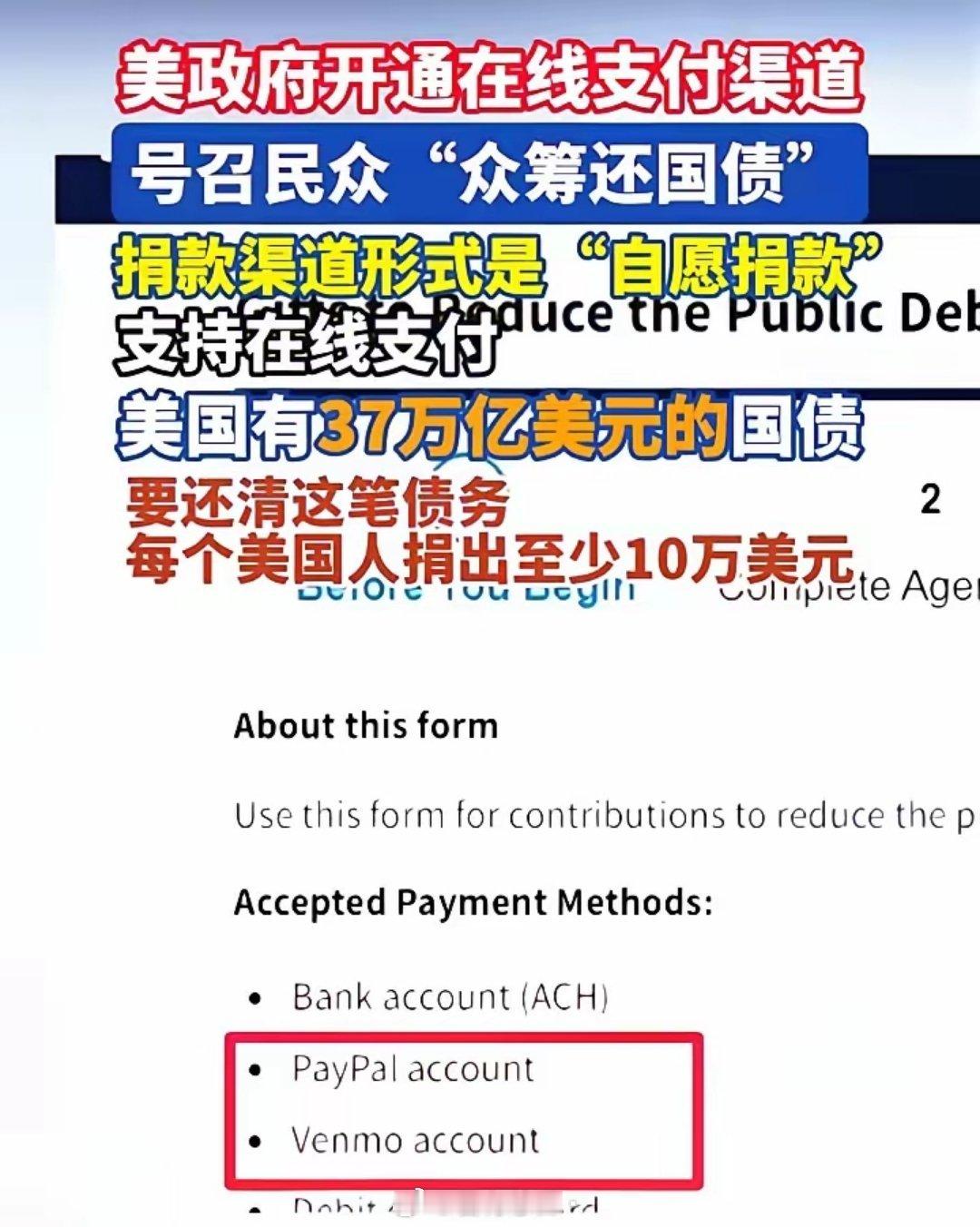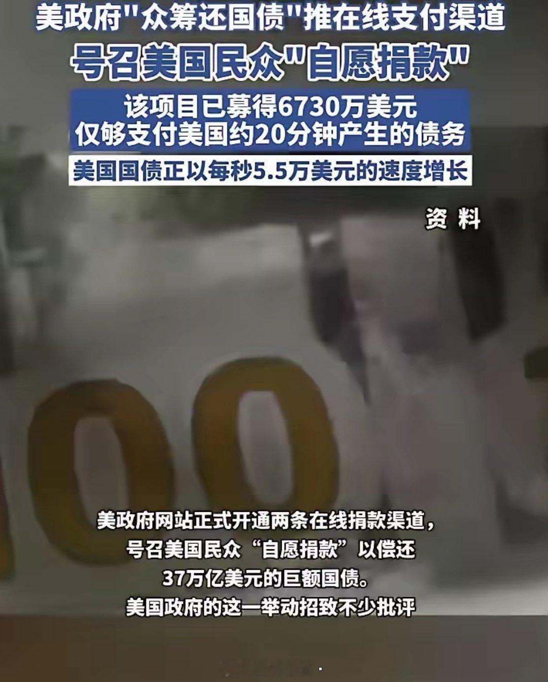灯塔国并非没有聪明人。瞧,美政府开通了在线支付账号,号召民众以自愿形式众筹偿还国债。美国国债总计37万多亿,若平均到人口基数,每人需承担约10万元。如图一所示截至目前,此次众筹共筹得6730万元捐款,这笔钱仅够支付20分钟仍在不断产生的国债。当下,美债正以每秒5.5万美元的速度持续增长。如图二所示此次捐款中,美国人是否会自觉自愿每人捐出10万,一次性还清美债,还有待进一步观察。