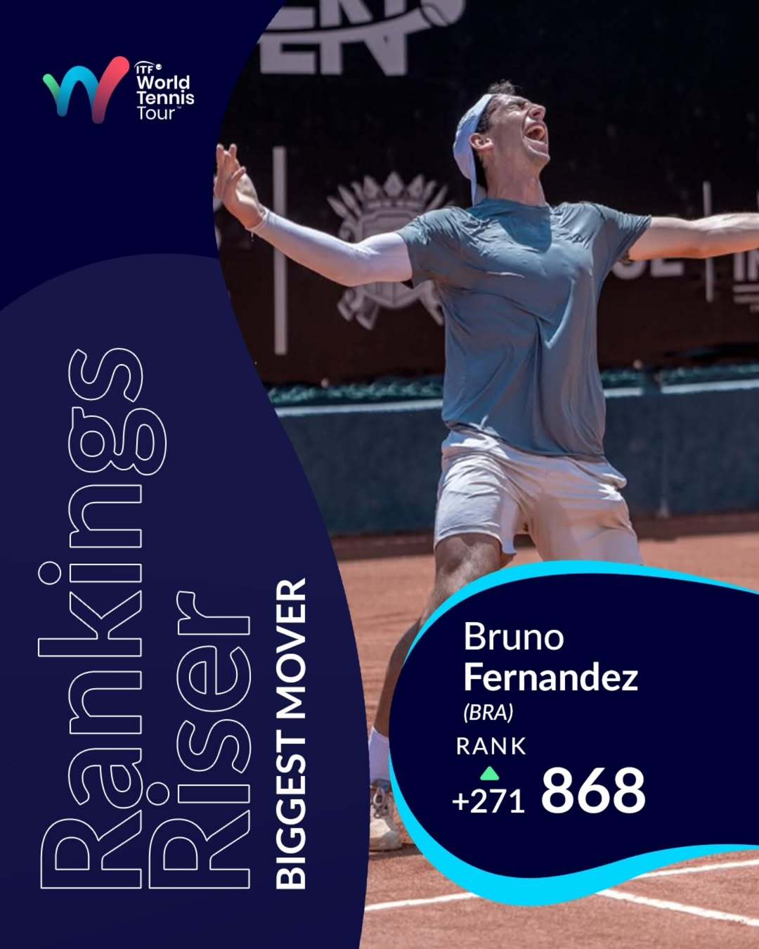 📈本周ATP排名进步幅度最大的球员:布鲁诺·费尔南德斯👏在M15伊瓦格站赢得职业生涯首个冠军后,这位巴西籍、年仅21岁的选手以巨大飞跃首次进入世界排名前1000!