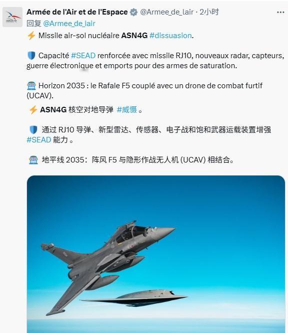 法国军事杂志认为2035年搭配UCAV等新技术的“阵风F5”战斗机可以称之为5++战斗机,那么按照这个逻辑歼-16+GJ-11“玄龙”无人机目前就可以称之为5++战斗机,J-20+玄龙可以称之为5+++战斗机烽火问鼎计划每天认识一件兵器 2023年,法国军事杂志Air&Cosmos称:“达索航空公司“阵风 F5”战斗机的革命性演变,将使它从 2030 年起超越美国的 F-35”成为5++ 代战斗机 🛠️ 无论是传感器、防护能力,还是联通性,这次的升级将是一场重大革命,以确保在空中保持对敌优势。 在核威慑方面,F5将配备第4代高超音速导弹ASN4G。 其对敌防空压制(SEAD)能力也将得到增强,整合内容包括: RJ10导弹, 新型雷达, 升级版电子战系统与光电传感器, 以及可挂载新型饱和攻击武器的挂点。 🤖 到2035年,阵风F5将具备与一架“隐身无人战斗机”(UCAV)协同作战的能力,这将为其提供更先进的打击手段。最终目标是:更容易进入高威胁环境,同时更好地控制作战风险。