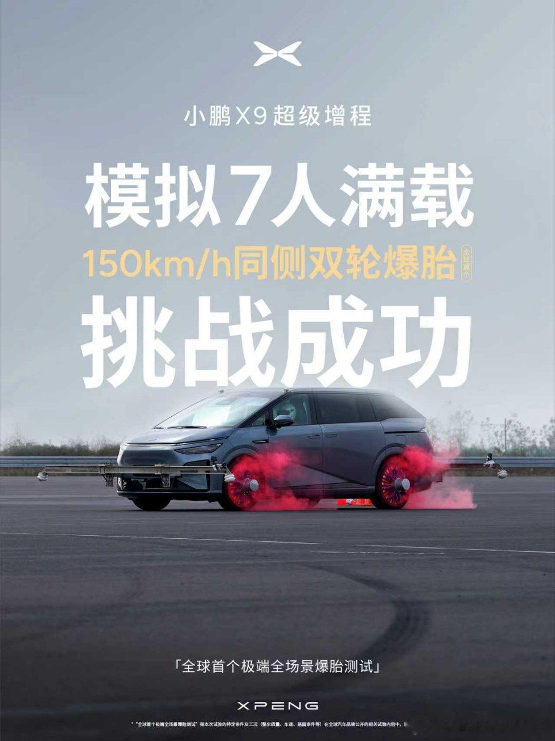 安全才是最大的豪华!小鹏X9超级增程「全球首个极端全场景爆胎测试」,在7人满载状态下,连续攻克积水路面、暴雨天气、模拟冰面、高速绕圆、下山急弯五大场景,涵盖60km/h至160km/h速度区间六大工况爆胎测试,全部挑战成功!此次测试验证了车辆在爆胎瞬间仍能保持稳定行驶与精准制动能力,无论常规路面还是极端工况,都能“稳得住,刹得停”,小鹏X9超级增程提供全球标准的安全冗余,全维度的安全保护,打造值得全球家庭信赖的「家用大7座」!
