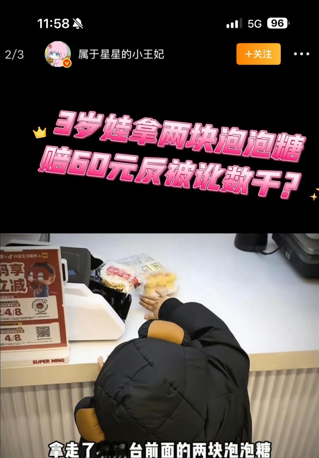 三岁小孩在超市拿了两块泡泡糖没付钱,他妈发现后马上带回去道歉,还按店家要求赔了60——这已经算很负责了。谁知道赔完钱,店家突然反咬一口,说孩子偷了店里几千块的东西,这不是明摆着讹人吗? 先说孩子“偷东西”这事。三岁的娃懂什么叫偷吗?法律上根本不承认这么小的孩子有“偷窃”的意图,顶多算是拿东西不知道要付钱。店家张口就说“偷”,还当着那么多人的面,这本身就不合适。 再说那60块钱。泡泡糖哪值这个价?店家随便拿张别人小票就让赔,这根本不算罚款,因为商家根本没权力罚款。妈妈愿意赔,是想着息事宁人,但不是他们能乱开价的理由。 最离谱的是后面说孩子偷了几千块商品。孩子爸来了之后很硬气,说只要拿出监控证据,愿意十倍百倍赔,可店家什么都拿不出来。没证据就乱指控,这已经涉嫌诽谤了了。按法律规定,公开污蔑别人可以拘留罚款,还要赔礼道歉、消除影响。 这件事给家长的提醒很实在:孩子不小心拿东西,及时道歉赔偿是对的,但不能任人宰割。遇到无理指控,就要像这位爸爸一样,坚持要证据,依法维权。如果店家损害了孩子名誉,该报警报警,该起诉起诉,别忍气吞声。 现在有些商家自己管理混乱,东西少了就随便找个孩子背锅,这种风气不能惯着。法治社会,讲的是证据,不是谁声音大谁就有理。