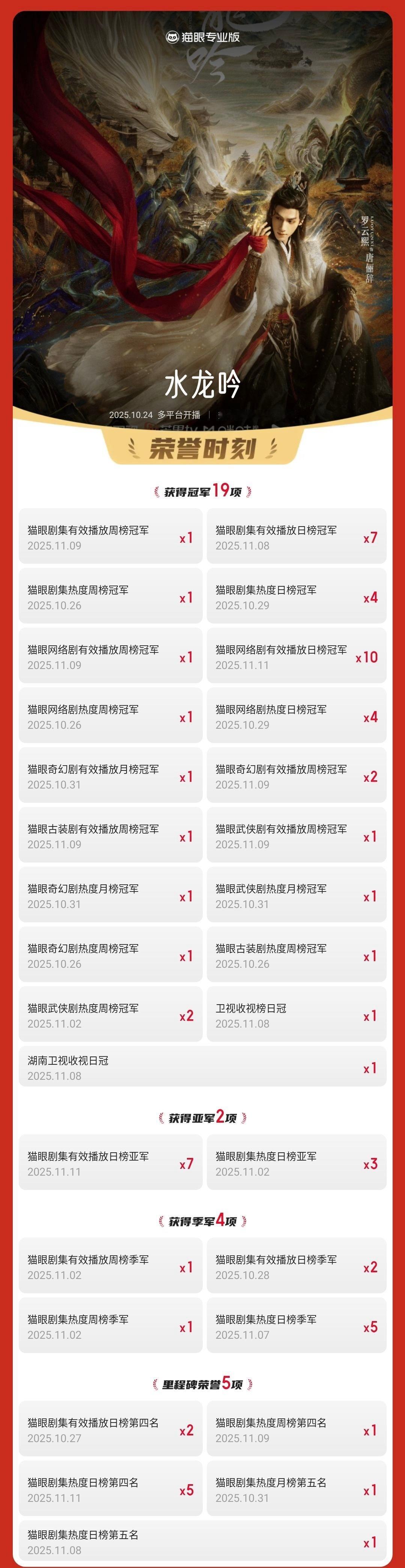 据猫眼专业版数据, (按演员姓氏首字母排名)领衔主演的网络剧《水龙吟》已累计10次登顶有效播放榜!