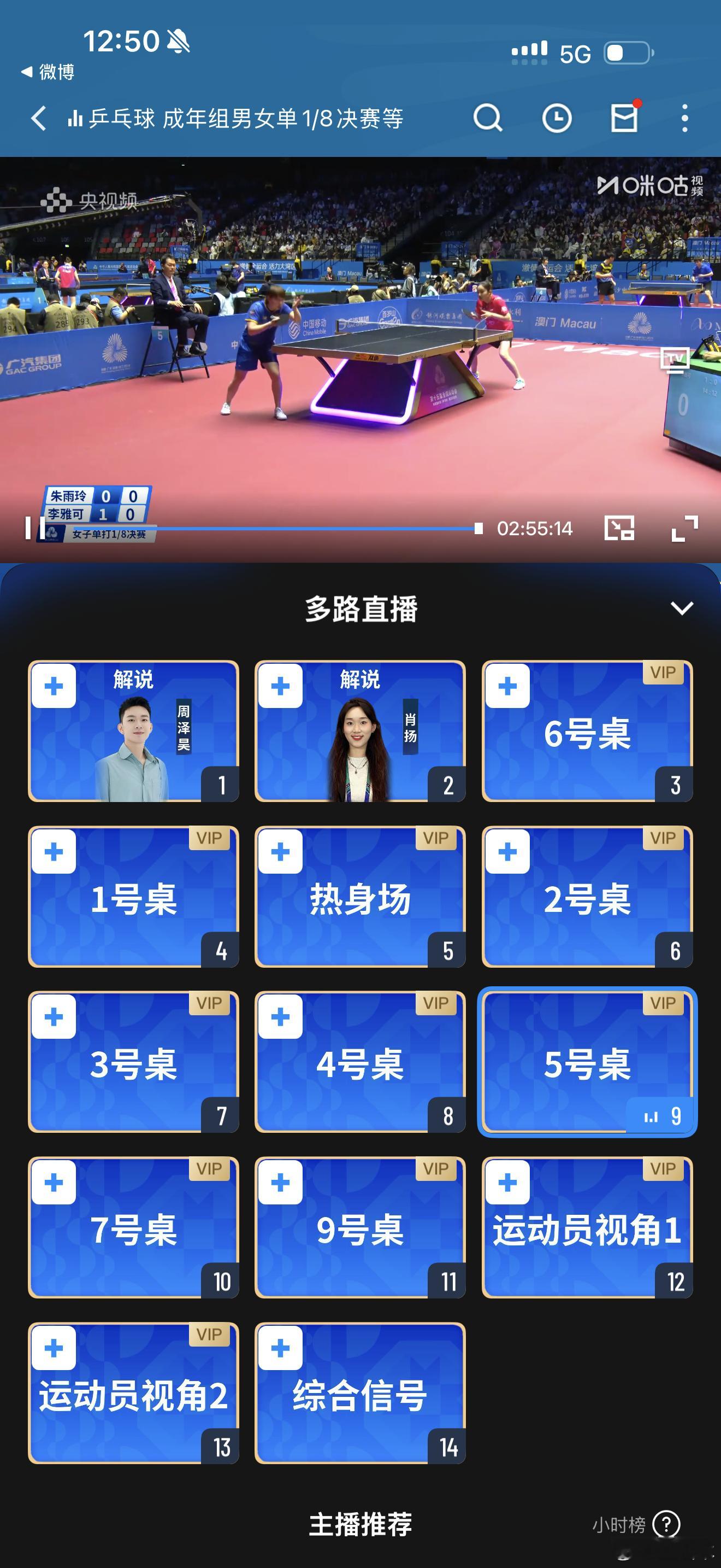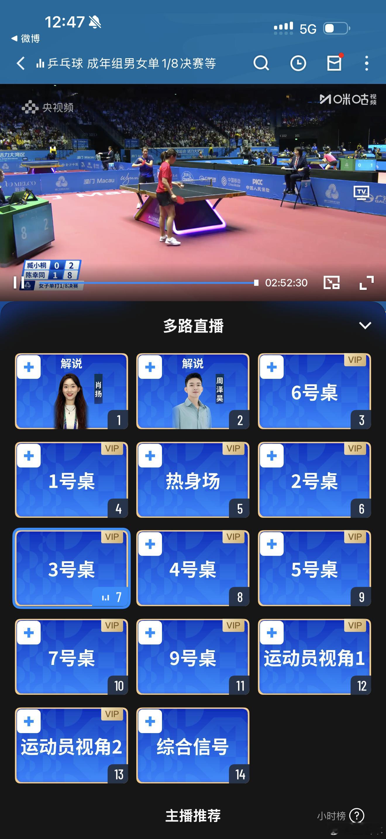 12:30 女单1/8 1号台 孙颖莎vs王晓彤 12:30 男单1/8 2号台