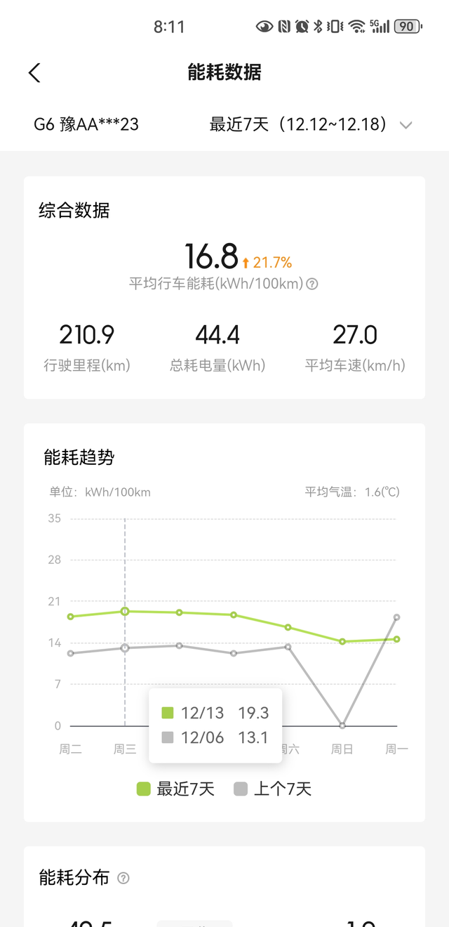 G6 755max中原地区冬季续航 纯城区工况,充电至90%,已跑276km,剩余121km,wltp续航折算为276/(530-121)=0.675。按这个掉电速度,电量跑干应该在350km左右(实际上谁敢跑干再充。。)。表显从来没高过20度,但实际能耗应该在22.5。