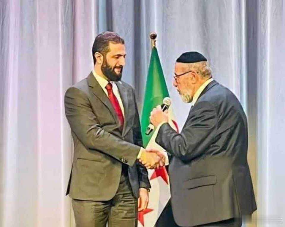 历史的一刻。叙利亚临时总统沙拉,访问白宫时,与华盛顿的一位犹太拉比握手。