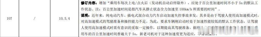 新国标征求意见稿,电动车、插混车等新能源车,启动后应处于零百加速大于5秒的默认工作状态。为了防止驾驶员对车辆不熟悉,加速过快,不容易操控。那么,你觉得这个国标征求意见稿怎么样呢?原文如下:“纯电动、插电式混合动力载客汽车应具备踏板误踩加速抑制功能,在静止、蠕行时能够检测,抑制动力输出并通过一个明显的信号装置 (例如:声或光信号) 提示驾驶人。”“近年来,纯电动汽车、插电式混合动力汽车启动加速失控事故多发,其多是由于驾驶人使用高加速模式时,对高加速模式的驾驶准备和操控能力不足。为此,要求车辆刚启动时处于加速性能较低的默认工作状态,让驾驶人使用高加速模式时需有意识的采取一定操作,以期提高其驾驶准备。”其实现在很多车都有驾驶模式,在采用ECO节能模式时,动力输出会减弱很多,这在油车时代很普遍。