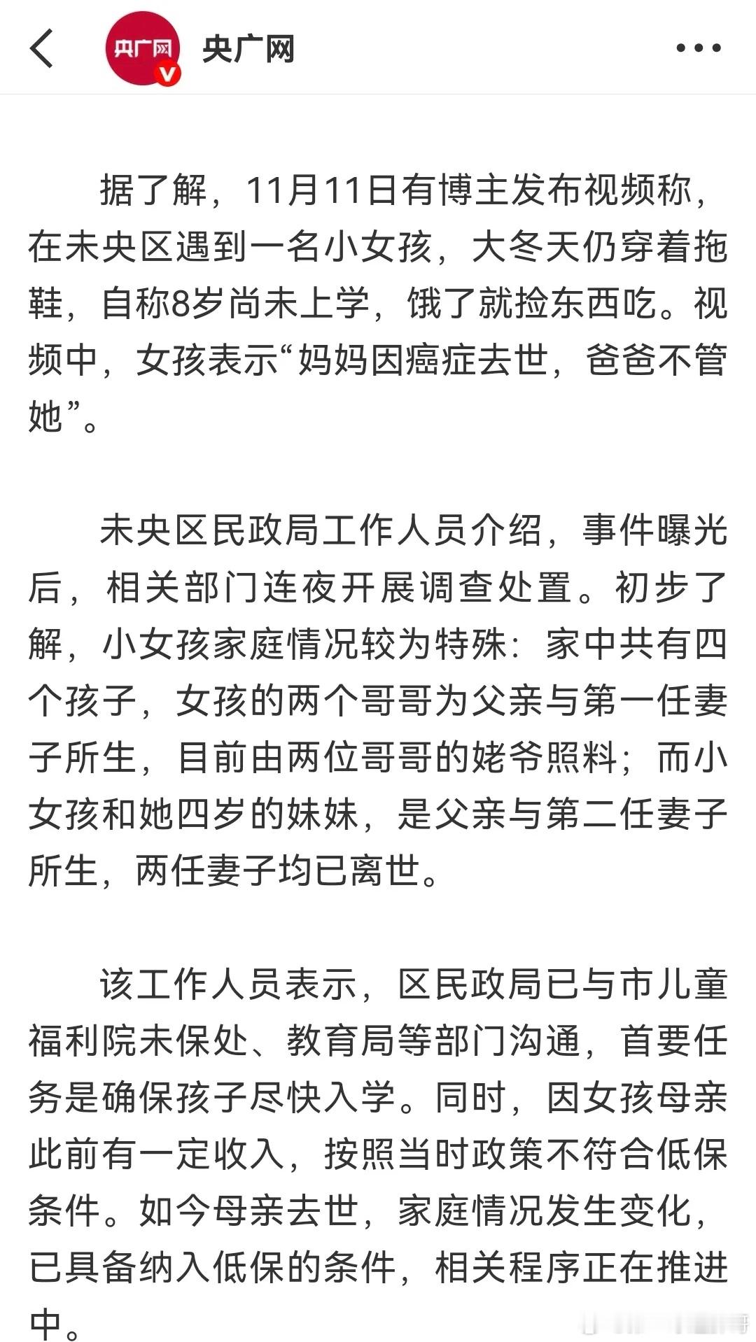 “8岁女孩冬天穿拖鞋流浪”,有后续了孩子的妈妈在天上急得团团转吧。为人父母,真的看不了这些。看到问询小女孩的视频。真的很心疼。小女孩说,“妈妈死了,爸爸在家不管我”都11月份了,小女孩上身穿着不合身的棉衣,下身穿着破洞牛仔裤,脚上就穿了双凉拖鞋。双脚得冻成什么样呀?8岁的小女孩呀!竟然没有去上学。也没见家人找。饿了也只能捡别人不要的东西吃。也不知道她流浪了多久。小女孩的妈妈,竟然是她爸爸的第二任妻子。她爸爸第一任妻子生的两个儿子,也是由孩子的姥爷在带。这个“爸爸”在其中,到底扮演一个什么角色呢?小女孩还有一个4岁的妹妹,也不知道那个妹妹过着怎样的日子。看报道,是因为之前女孩的妈妈有一定收入,不符合低保条件。女孩妈妈去世了,就具备纳入低保的条件了!所以,女孩的爸爸甚至都没有工作?女孩的爷爷奶奶?外公外婆呢?最后还是国家兜底?真的不能理解,那些生了孩子却不管的家庭。也真没想到,本以为“每个孩子在家都是宝贝疙瘩”,却还有孩子过着这样的生活。