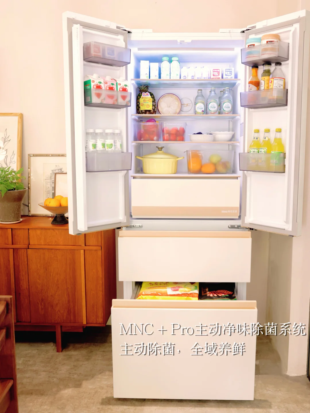 冷藏有MNC + Pro主动净味除菌系统,主动除菌,全域养鲜;冷冻也搭载了全空间净化,抗菌率99.99%,净味率99.2%。