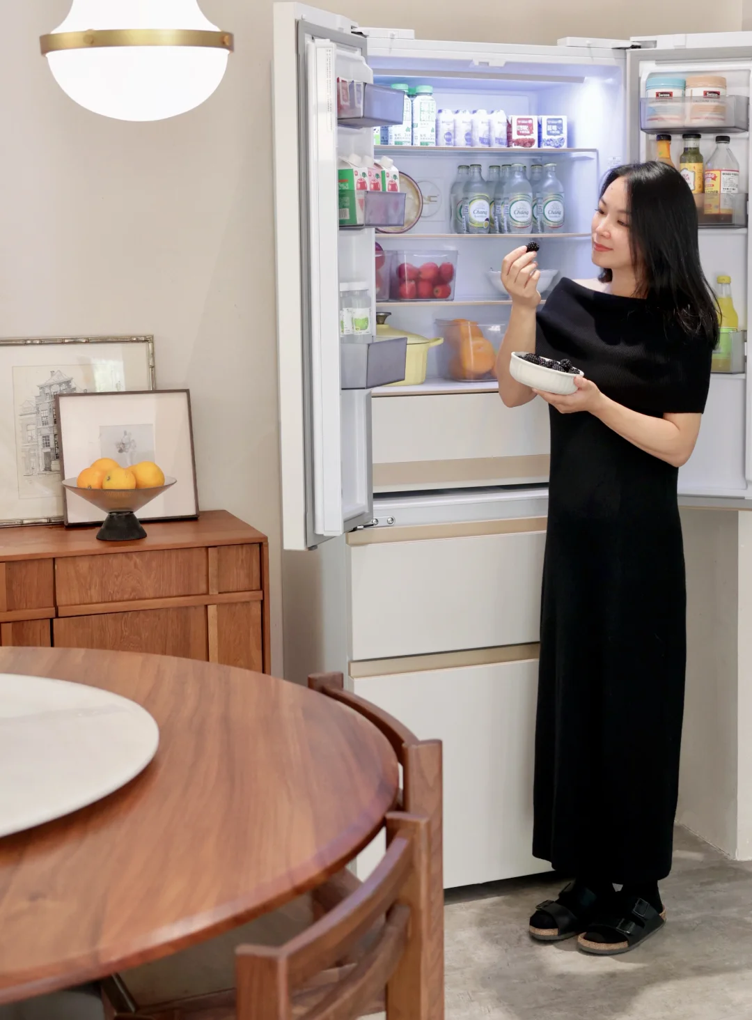 它的颜值也超高,杏悦白面板搭配暖色内饰,暖色调给人一种温馨治愈的感觉,和我家原木风的装修风格相得益彰,每次走进餐厅,看到它心情都变好了。