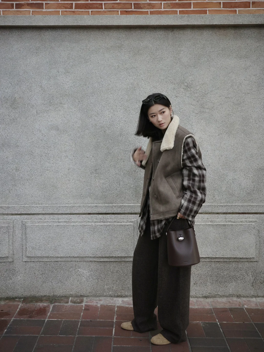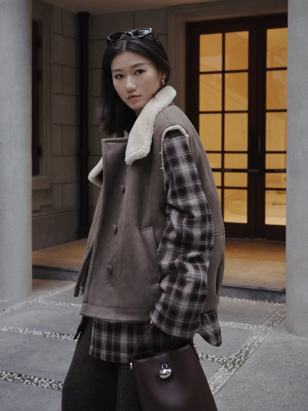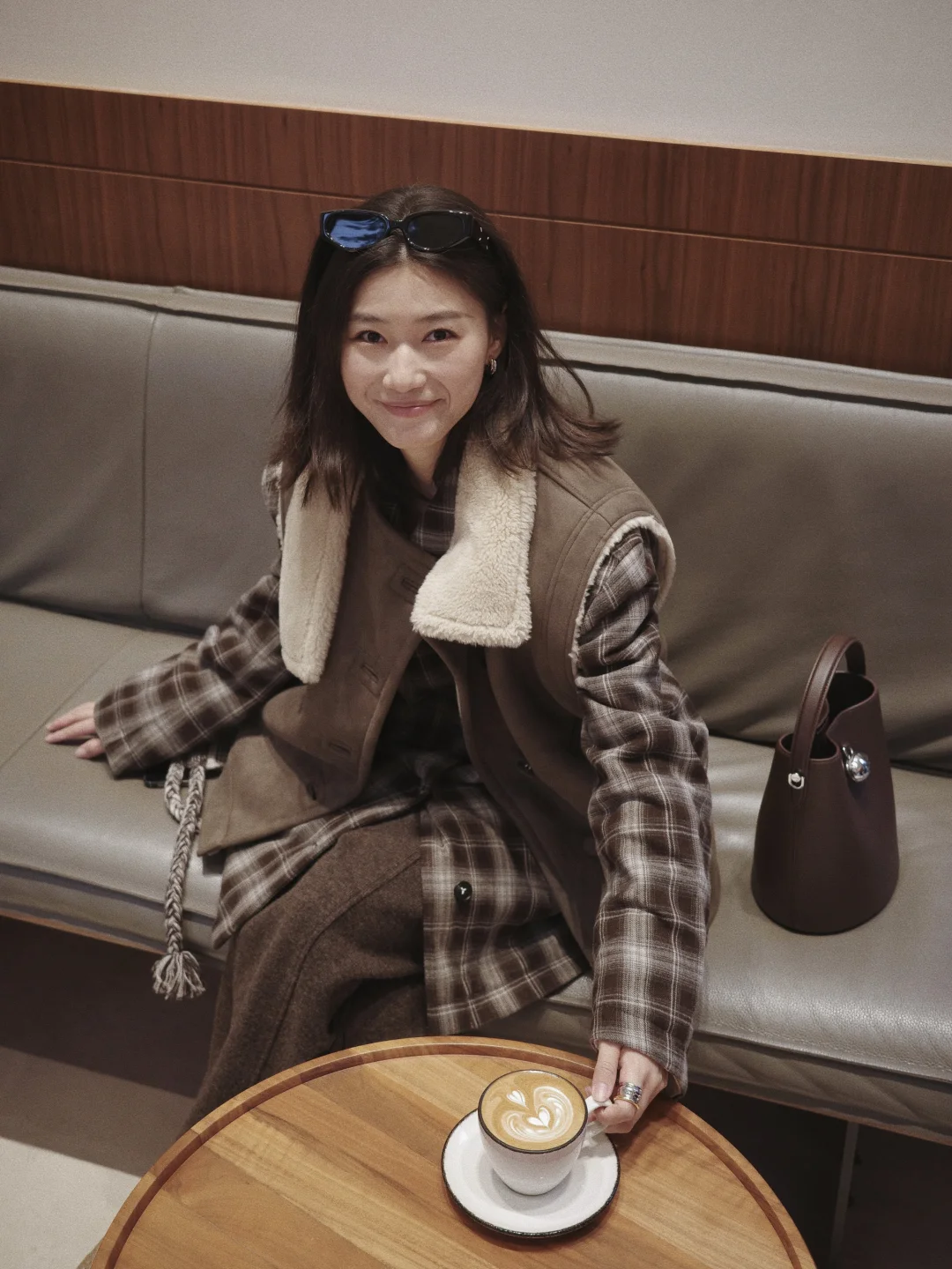 格纹衬衫&羊羔毛背心:YOEYYOU