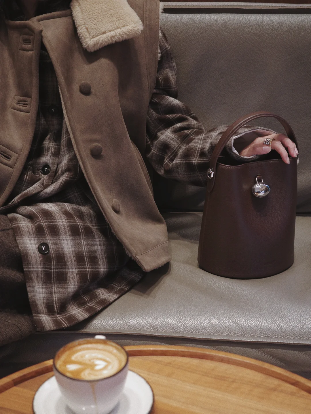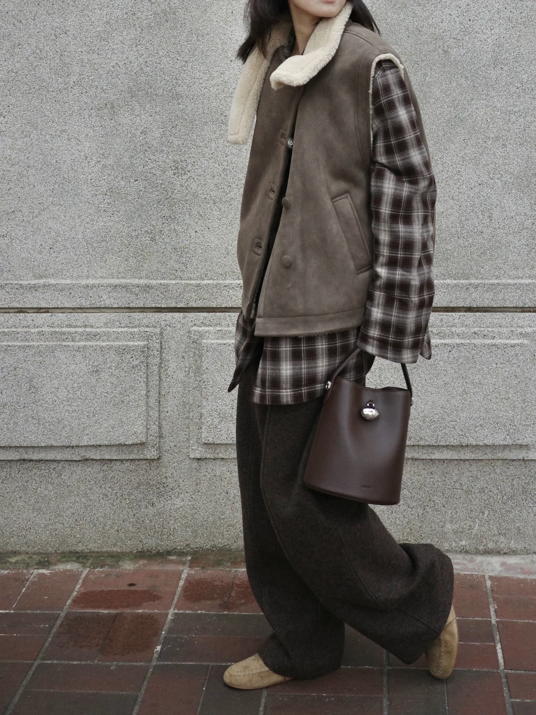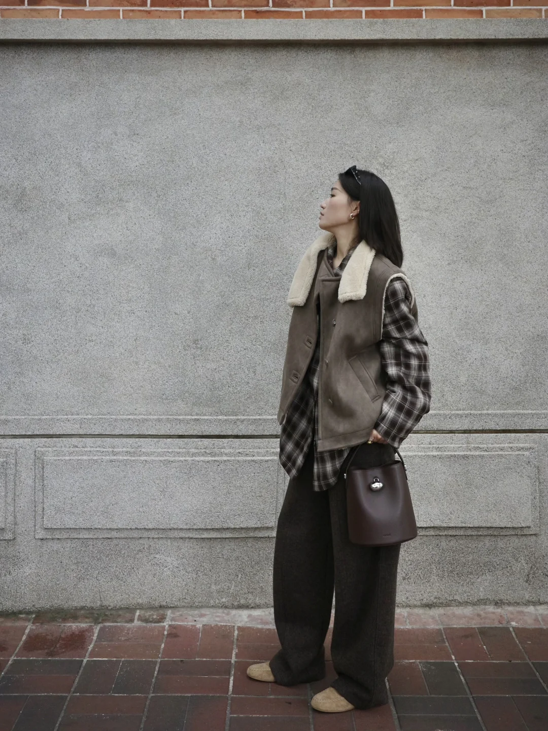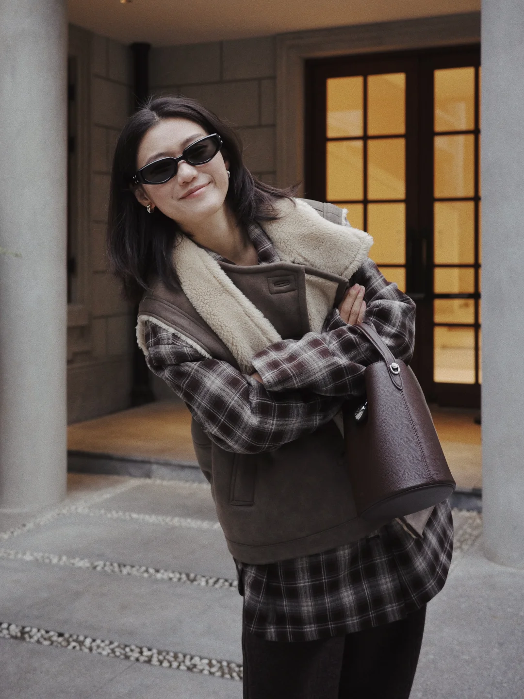 格纹衬衫&羊羔毛背心:YOEYYOU