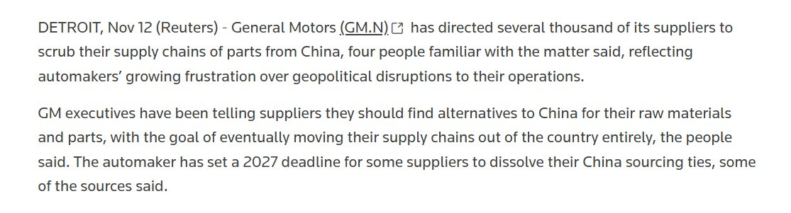 【通用汽车(GM)欲2027年年底终止与中国采购关系的联系】根据路透社报道,通用汽车(GM)已指示其数千家供应商从供应链中清除来自中国的零部件,最终目标是将整个供应链完全迁出中国,以避免地缘政治因素带来的运营干扰。 报道引述四位知情人士称,GM高管已要求供应商寻找中国以外的原材料和零部件替代来源,并为部分供应商设定了2027年的最后期限,要求终止与中国采购关系的联系。PS 上汽通用不涉及此类,只是底特律那边