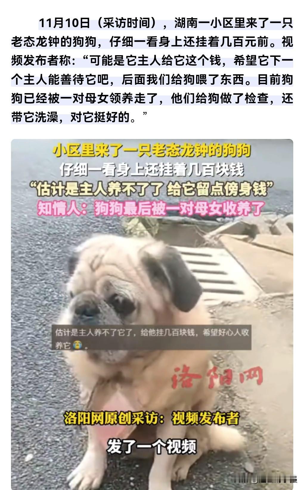 这是真的还是假的呀?希望不是摆拍。 近日(报道)。 老狗身挂几百元在小区求收养。 这主人还挺好的,竟然还留了几百块钱在狗的身上。 这条老狗也是很幸运。 被好心人收养了。 还带去检查和洗澡了。 应该能安享晚年了。