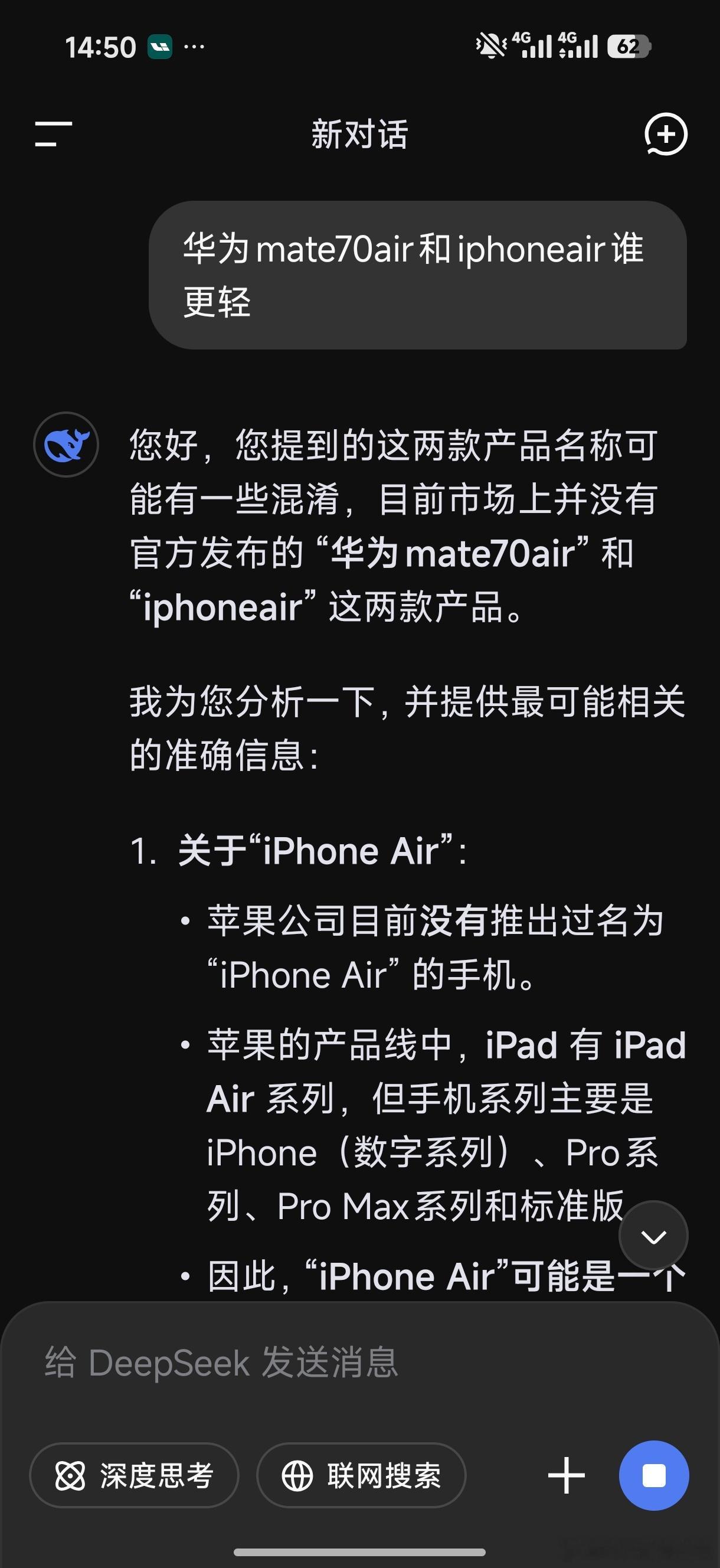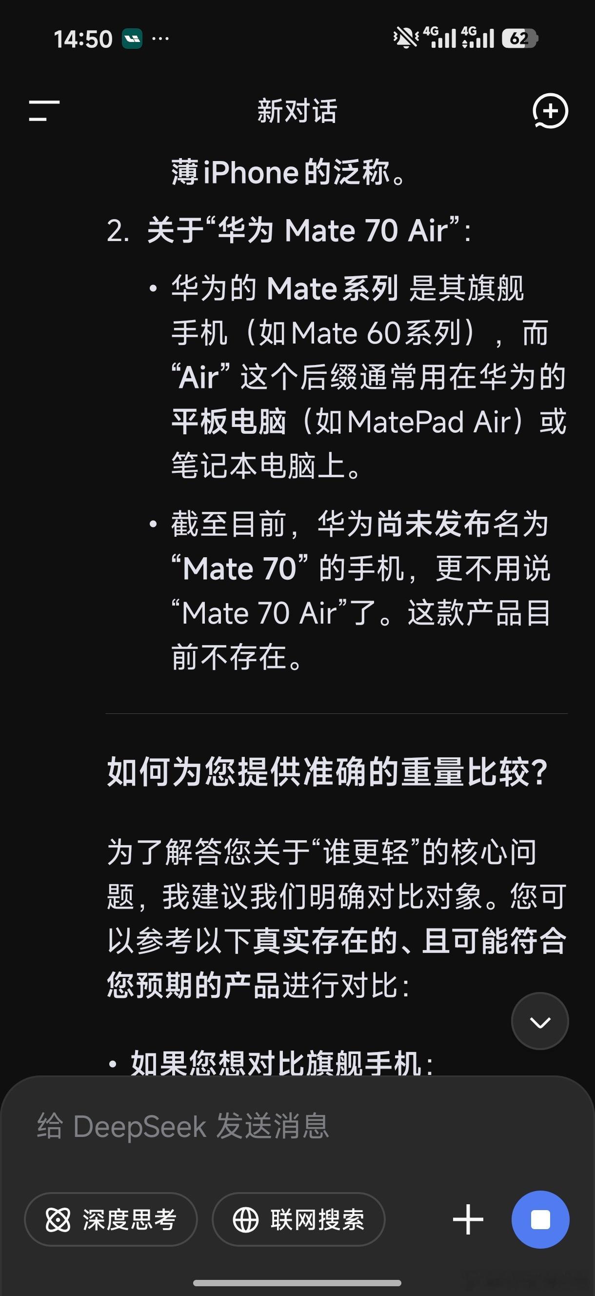 因为Deep seek一本正经的胡扯,我都不用了我问它小米yu7,他给我一堆小米su7还竟胡说八道没有华为mate70air