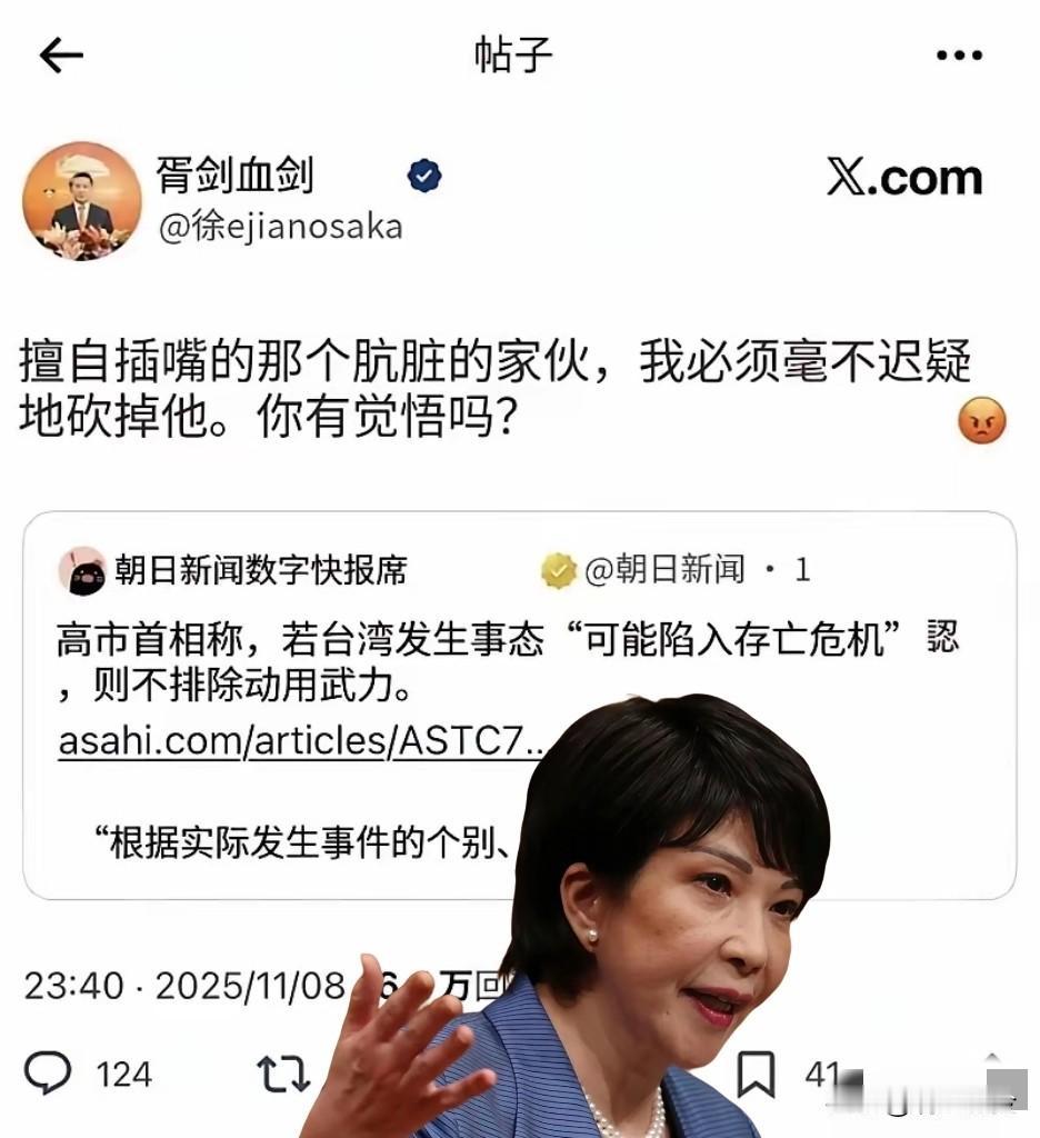 高市早苗这“强硬派”政客,公然声言若台湾有事日本将动用武力干预,实在是明目张胆干涉中国内政。她从1994年就参与美化希特勒选举策略的书籍,还长期参拜靖国神社,毫无反省侵略历史的态度。在涉台问题上更是早有预谋,如今出任首相后更是狂言不断。 面对她这番言论,中国驻日本大阪总领事薛剑在社交平台霸气评论“只能毫不犹豫地斩掉那擅自闯入的肮脏头颅”。此言一出,在日本彻底火出圈,日本上下疯狂炒作“崭首说”、各种抗议。不得不说薛剑总领事这番话太解气,对这种肆意挑衅的行为就该强硬回击!
