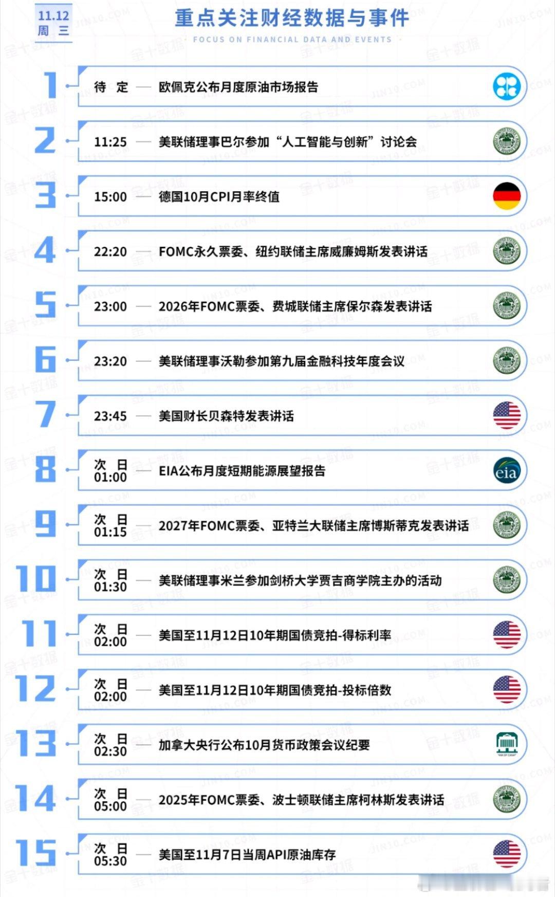 今日重点关注的财经数据与事件:2025年11月12日 周三① 待定 欧佩克公布月度原油市场报告② 11:25 美联储理事巴尔参加讨论会③ 15:00 德国10月CPI月率终值④ 22:20 美联储威廉姆斯发表讲话⑤ 23:00 美联储保尔森发表讲话⑥ 23:20 美联储理事沃勒参加会议⑦ 23:45 美国财长贝森特发表讲话⑧ 次日01:00 EIA公布月度短期能源展望报告⑨ 次日01:15 美联储博斯蒂克发表讲话⑩ 次日01:30 美联储理事米兰参加活动⑪ 次日02:00 美国至11月12日10年期国债竞拍-得标利率⑫ 次日02:00 美国至11月12日10年期国债竞拍-投标倍数⑬ 次日02:30 加拿大央行公布10月货币政策会议纪要⑭ 次日05:00 美联储柯林斯就经济和金融形势展望发表讲话⑮ 次日05:30 美国至11月7日当周API原油库存