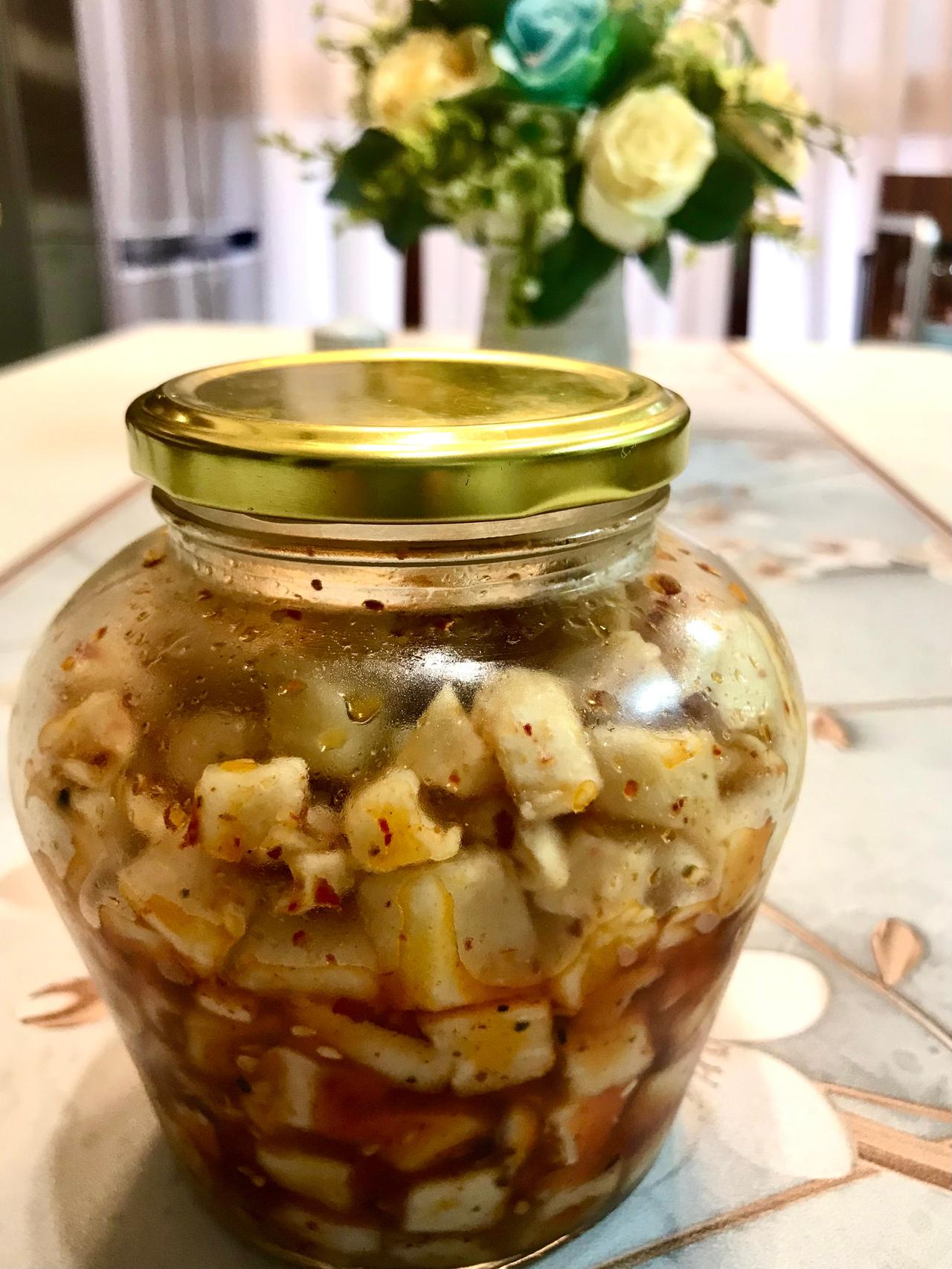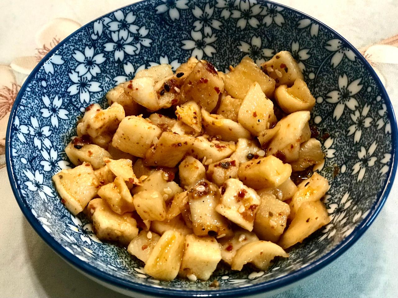 看看,这是我自己做的凉拌白萝卜干。前几天兴之所至,决定自己做白萝卜干。 在我们成都的一些地方,有卖白萝卜干的,品牌好几种,口味大同小异。 都是用白萝卜切成丁、晾干,加上各种调料,吃起来脆蹦蹦的,口感香辣鲜香,我和先生都爱吃。 可是,毕竟外面买的,还是不太放心其卫生,也很担心有没有加防腐剂之类的,所以尽管很喜欢吃,也只是偶尔买。 现在入冬,白萝卜大量上市,寻思着,不如自己动手做一点吧。 简单询问了一下曾经做过萝卜干的同学,就开始动手制作。 把白萝卜洗净,带皮切丁,撒上少许的盐,略微腌制。 不过片刻功夫,那萝卜丁便像出了汗似的,渗出许多清清亮亮的水来。 将这水滗掉,便是晾干的工序了。 在成都,很少有大太阳天气,尤其深秋至冬天,大部分时候天空灰蒙蒙,阴冷潮湿,就不指望它自然晾干了。 所以我采用烤箱低温烘烤(大概只有30~40度),一天功夫,它就由莹润的白,渐渐收敛成一种微黄而紧实的模样。 然后自己炼油。 清油入锅,微热之后,加入山奈、八角、草果、小茴香、香叶、桂皮、砂仁、豆蔻、丁香等等香料,再加入洋葱、香菜、大葱,一起在锅里熬制。 不多时,满屋便交织着一种复杂而温暖的香气,不是单一的香,而是浑厚的、圆融的,仿佛能将冬日里的阴湿驱散几分的香。 把练好的油,用勺子舀起,高高地、慢慢地淋在干海椒面、花椒面、少量白芝麻上面,只听“滋啦”一声,一团带着焦香的蒸汽猛地腾起。 随之,一股霸道而热烈的辛香,便像有了生命一般,直往你的鼻孔里钻,仿佛能唤醒身体上每一处沉睡的神经。 再将那红亮亮、香喷喷的熟油海椒,连同适量的盐、糖、味精等一应调料,一齐浇在那些看似无趣的、白生生的萝卜干上。 筷子拌匀的刹那,真如魔法一般。 那单调的咸味,立刻被香料的丰腴、辣椒的炽烈、花椒的麻爽所包裹、所提升。 此时的它,不再是原先那个朴拙的萝卜丁了,它变得色泽诱人,滋味层层叠叠,成为了一件色、香、味俱佳的作品。 看看这盘自己做的凉拌萝卜干,样子或许有些拙朴,不如市售的齐整漂亮。 但夹一筷入口,“咔嚓”的脆响在齿间迸发,麻辣鲜香,干净而纯粹,绝不输给外面卖的。 更重要的是,这一碟小菜里,有自己的心思,有守候的时间,更有对一餐一饭的郑重,它干净,踏实,能让人放心大嚼。 看着这盘小小的、红白相间的萝卜干,心里满是静静的安然。 还是人间烟火味,最抚凡人心啊。 欢迎关注@丁丁的慢时光