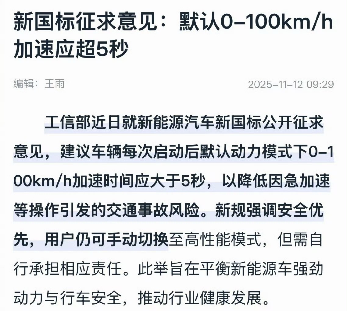 现在绝大部分新能源车,即使是加速成绩在2-3秒级的,默认的标准/舒适模式一般也都在5秒开外。例如最猛的SU7 Ultra,默认的标准模式只有439马力,其实并不快。瞎逼开的,一定会手动切到高功率输出的模式,还有更瞎逼开的还会手动关车身稳定系统。感觉这个规定似乎没多大意义…