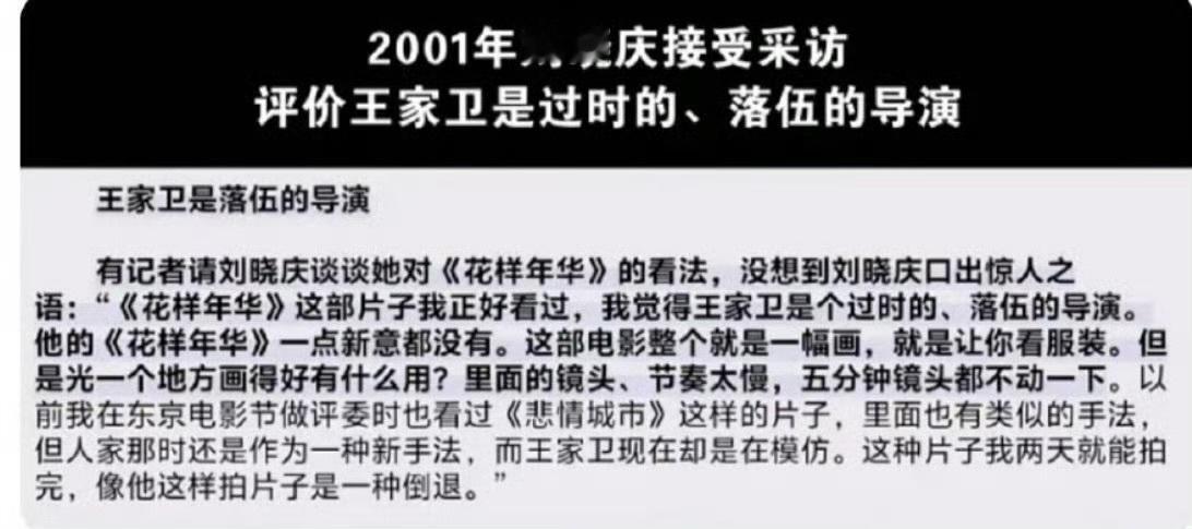 王家卫的电影是出了名的票房差,说明根本没多少人爱看他的电影,可是在互联网上,很多人提起王家卫就是一套一套的,好像自己看懂了王家卫就很有深度和品位了似的,其实不就是因为自己没文化,跟着王家卫装装逼吗?像兔兔和刘晓庆这样坦率、犀利并且又有文化和内涵的人太少了,我们真的是英雄所见略同!