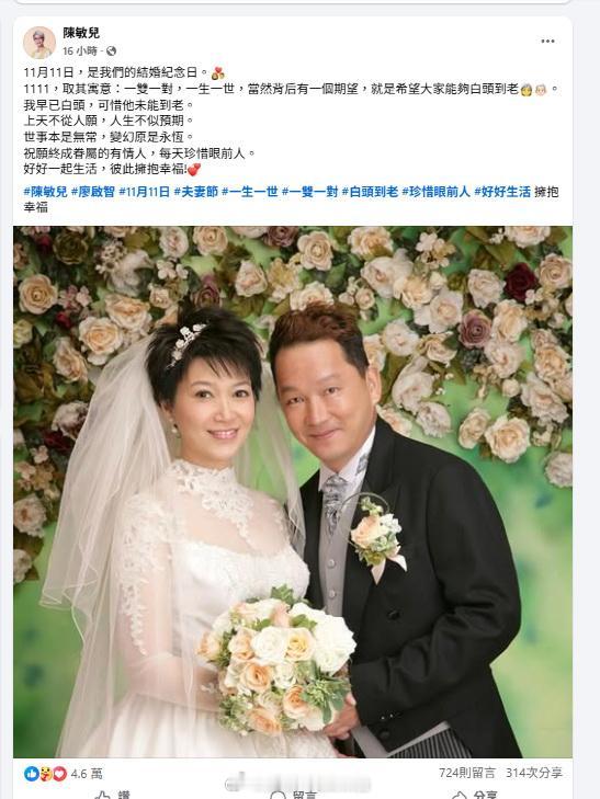陈敏儿结婚38周年追忆廖启智 婚纱照寄语句有情人珍惜当下资深演员廖启智(智叔)2021年病逝,遗孀陈敏儿至今仍然挂念。昨天(11日)是两人结婚38周年的日子,陈敏儿一如往年于社交平台上载婚纱照及发文,她说:“11月11日,是我们的结婚纪念日。1111,取其寓意:一双一对,一生一世,当然背后有一个期望,就是希望大家能够白头到老。我早已白头,可惜他未能到老。上天不从人愿,人生不似预期。世事本是无常,变幻原是永恒。祝愿终成眷属的有情人,每天珍惜眼前人。好好一起生活,彼此拥抱幸福!”