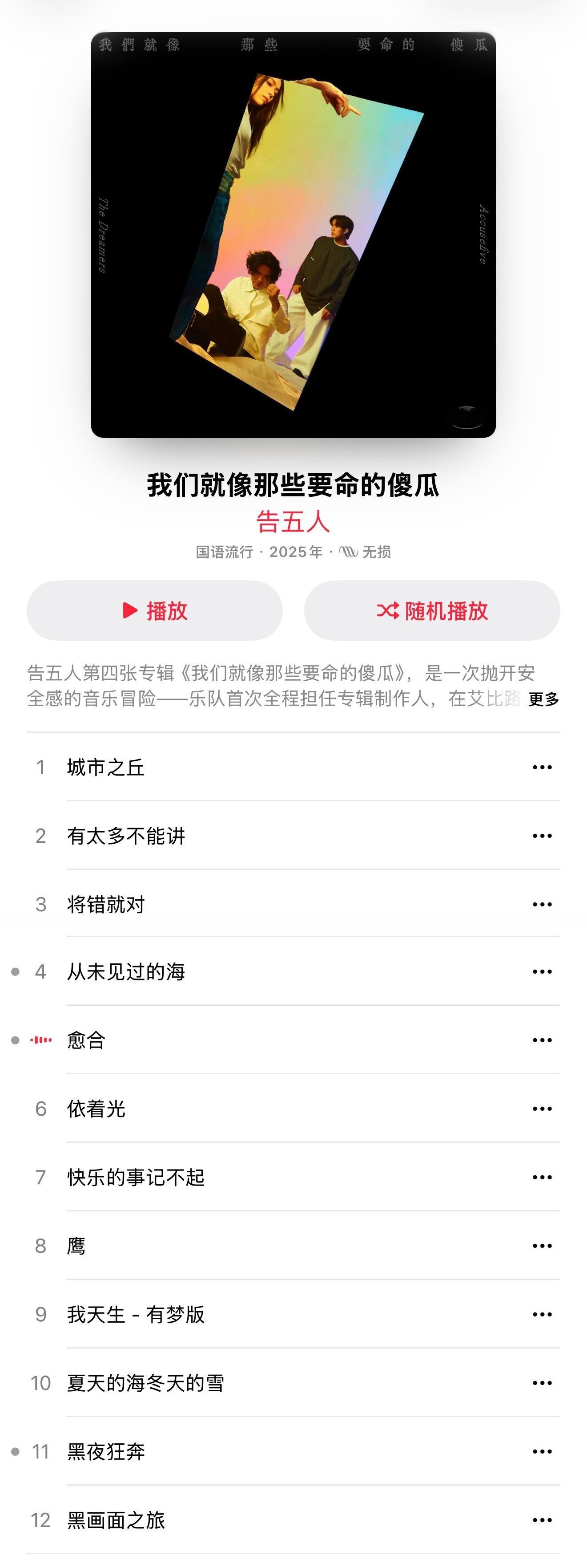 正好在听告五人今年发行的新专辑,平心而论,这张整体的编曲制作比上张厉害,但词曲大部分还是很普通,少有惊艳之作了。