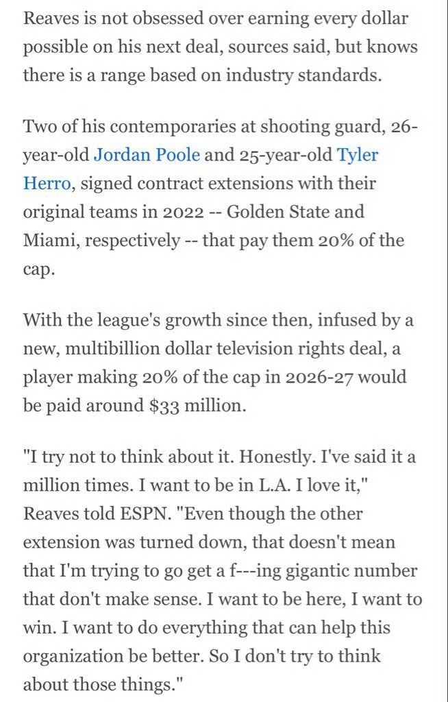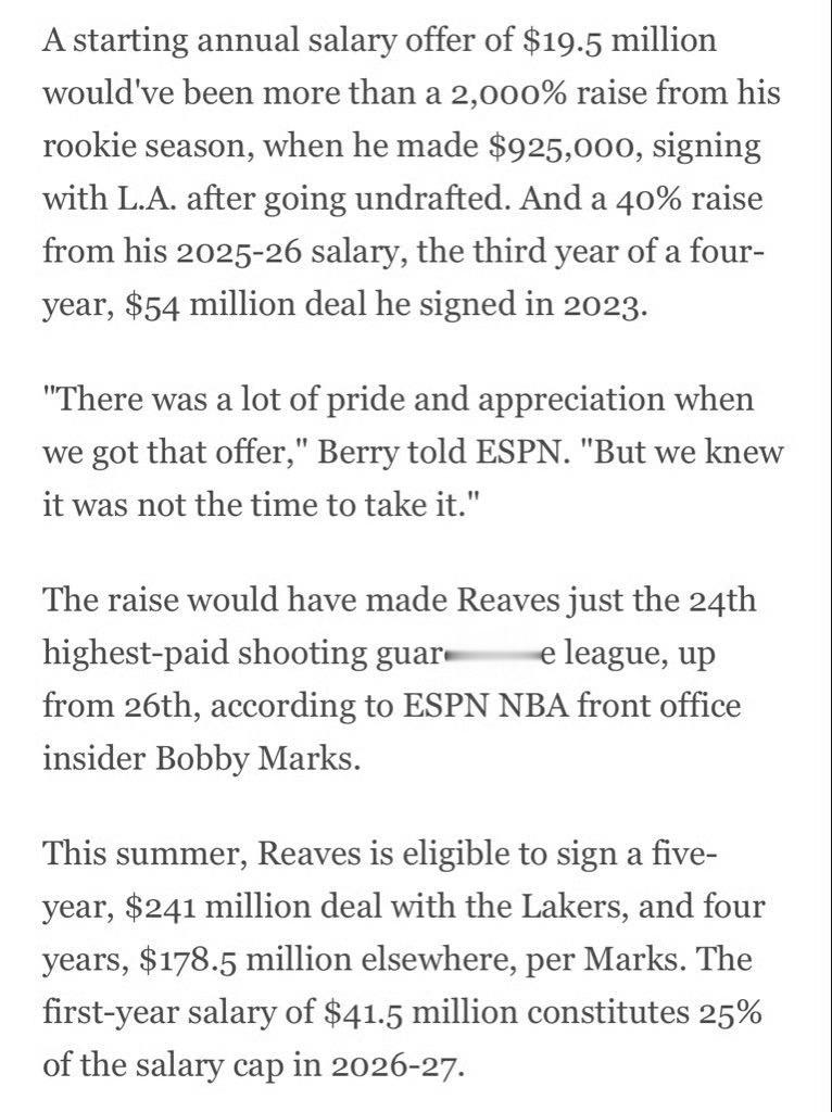 Dave撰文里夫斯,拒绝高薪只为留队争冠,真正的湖人!洛杉矶湖人队球员奥斯汀·里夫斯近日拒绝了一份极具诱惑力的续约报价。据ESPN报道,这份1950万美元的起始年薪,相比他新秀赛季的92.5万美元,涨幅超过2000%,比他2025-26赛季的薪水高出40%。尽管如此,里夫斯和他的经纪人选择了拒绝,经纪人告诉ESPN:"当我们收到那份报价时非常自豪和感激,但我们知道现在不是接受它的时候。"据薪资专家Bobby Marks分析,若接受这份报价,里夫斯在联盟得分后卫中的薪水排名将从第26位升至第24位。不过,这与他未来可能获得的合同相比,仍有差距。今年夏天,里夫斯将有资格与湖人队签下一份5年2.41亿美元的合同,也可以与其他球队签下一份4年1.785亿美元的合同。2026-27赛季,4150万美元的第一年薪水将占工资帽的25%。尽管面临巨额合同,里夫斯表示自己并不执着于追求拿大合同。他在接受采访时说:"老实说,我尽量不去想这些。我已经说了无数次了,我想留在洛杉矶,我爱这里。即使拒绝了那份续约合同,也不意味着我要去追求一个不合理的天价。我想留在这里,我想赢球,我想尽我所能帮助这支球队变得更好。"值得注意的是,里夫斯的两位同龄人,26岁的乔丹·普尔和25岁的泰勒·希罗,都在2022年与各自的母队签下了占工资帽20%的续约合同。随着联盟的发展,尤其是受一份价值数十亿美元的新电视转播权协议的推动,2026-27赛季一名占工资帽20%的球员的薪水将达到约3300万美元。里夫斯的选择显示了他对湖人的忠诚和对夺冠的渴望,也为他未来的职业生涯增添了更多期待。