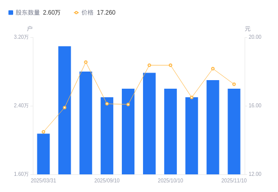 日期A股户数(户)流通A股户均持股数(股)户均持股市值(万元)2025-11-10260009520.4116.432025-10-31270009167.8016.662025-10-20250009901.2316.332025-10-10260009520.4117.492025-09-30278508888.0016.332025-09-20260009528.5315.322025-09-10250009909.6715.972025-08-29280008847.9216.412025-06-30309558003.2812.732025-03-312075511936.4817.28