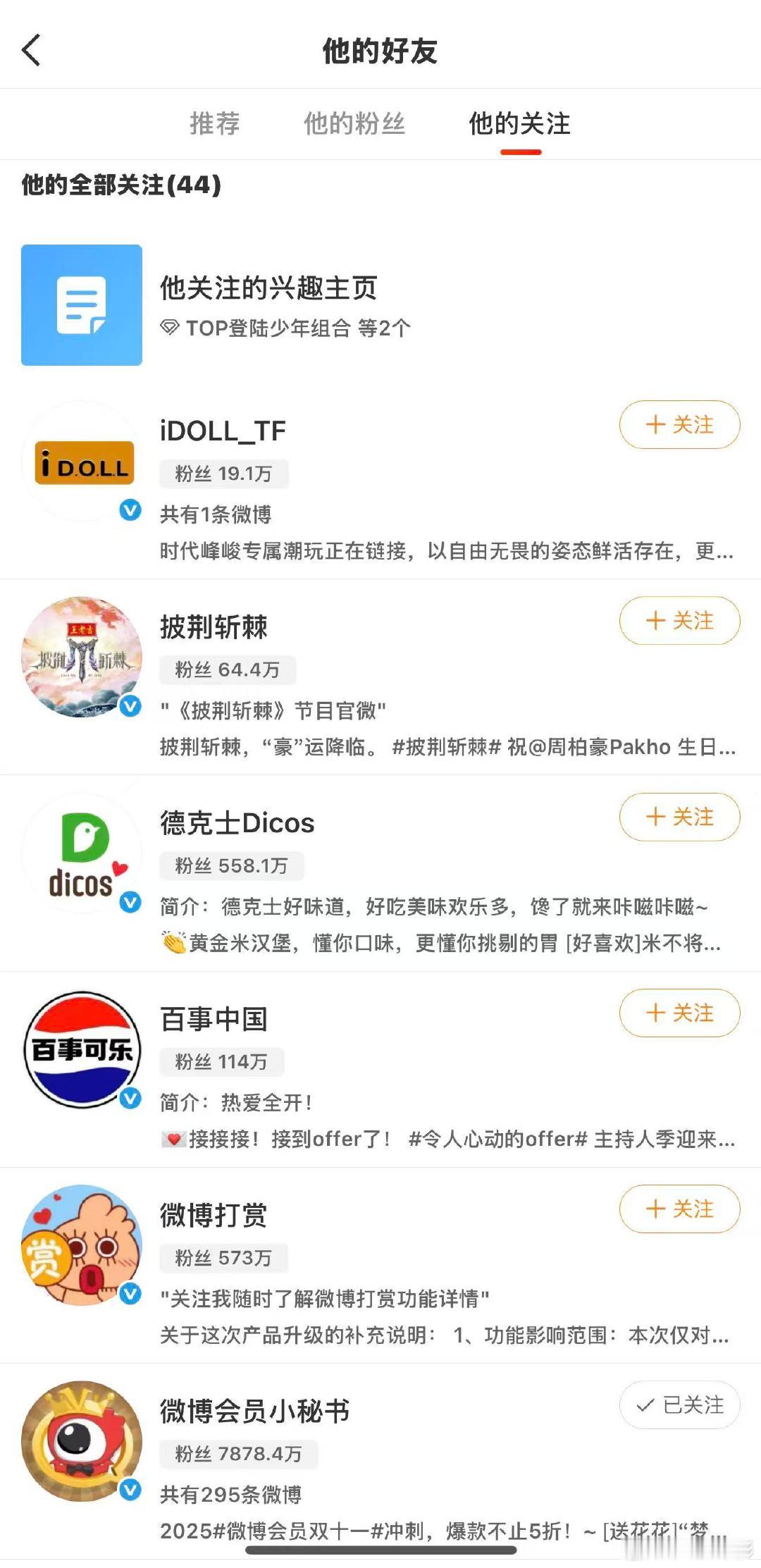 11月12日, 关注了 新账号。目前,登陆少年组合关注列表已经找不到该账号,疑似已取关。