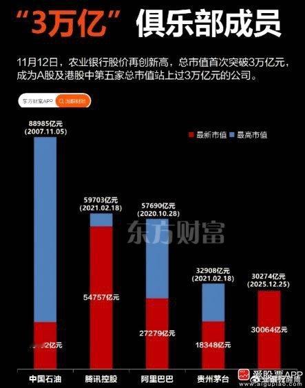 【第5家!时隔四年半 “3万亿”俱乐部再添一员】11月12日,农业银行盘中一度涨超4%,总市值(A股股价xA、H股总股本)首超3万亿整数大关,盘中最高涨至30274万亿元,成为A股首家迈入“3万亿俱乐部”的银行,同时也成为A股及港股中第五家市值站上过3万亿元的公司。 上一次A股出现“3万亿”还是在2021年2月初,当时贵州茅台股价持续大涨市...
