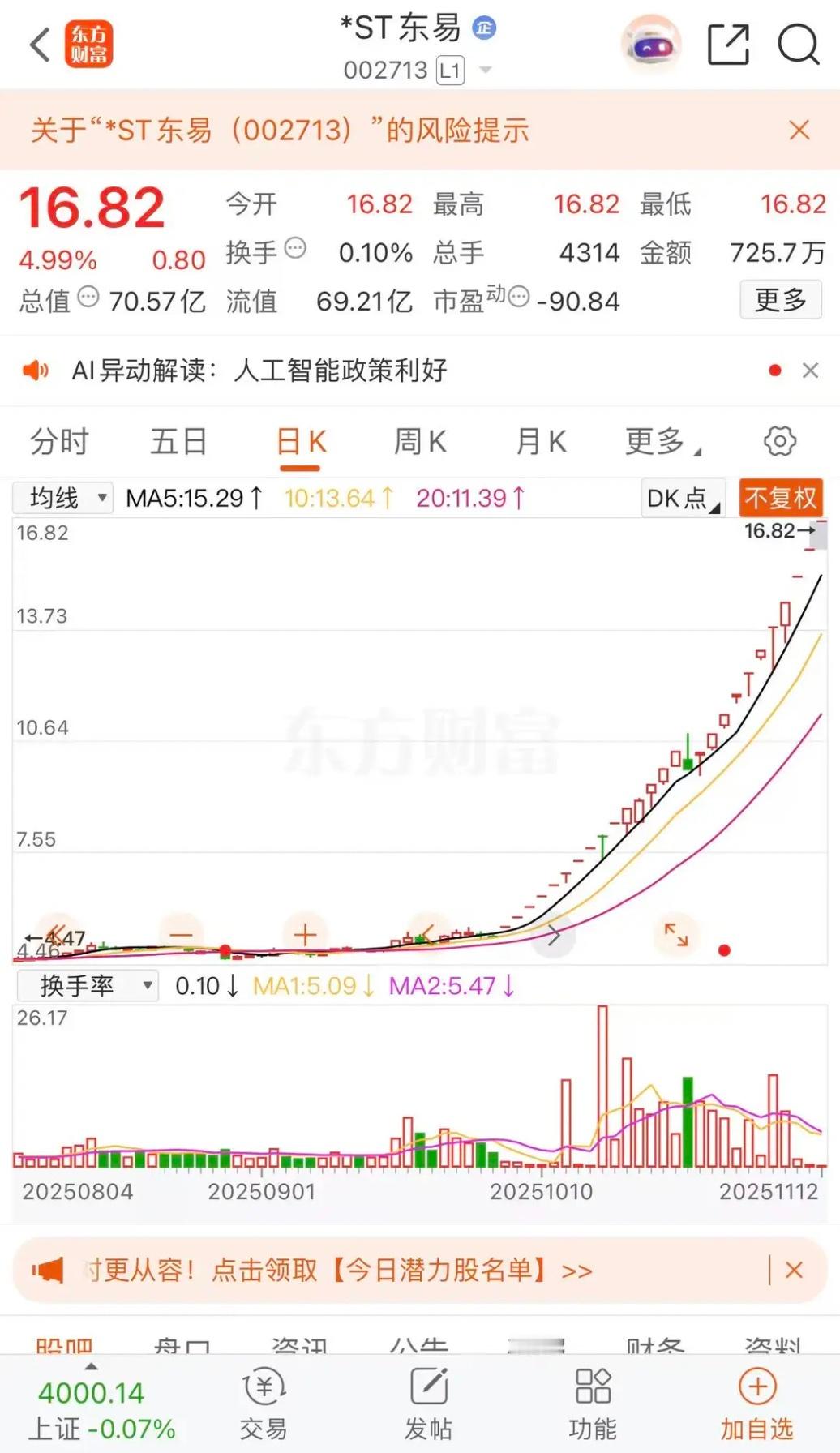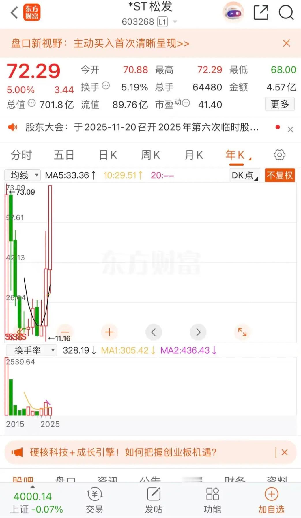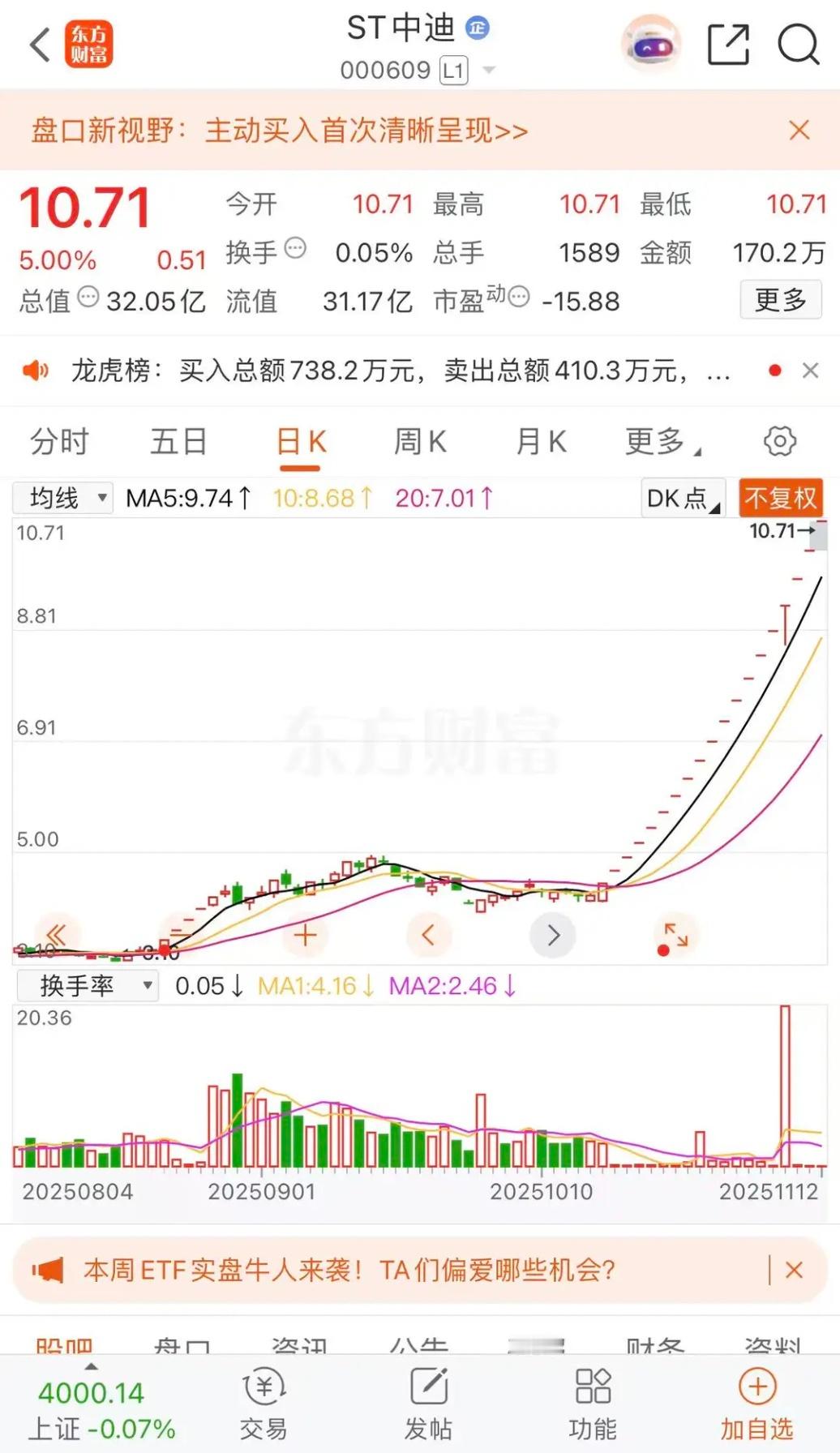ST股才是最强王者,*ST松发,*ST东易,ST中迪停牌核查。ST中迪涨停板收盘报收10.71元每股,成交金额170.2万元。19天19涨停板。明天开始停牌核查*ST松发涨停板收盘报收72.29元每股,成交金额4.57亿元,很快要突破历史新高73.09元每股,未来百元股,只从戴星戴帽涨得更欢。*ST东易涨停板收盘报收16.82元每股,成交金额725.7万元,30天22个涨停板。*ST亚振已经快要20倍了,看来大家都是在5%涨停板规则变化前拼命的涨涨涨涨涨涨。原来跨年妖股在ST股。