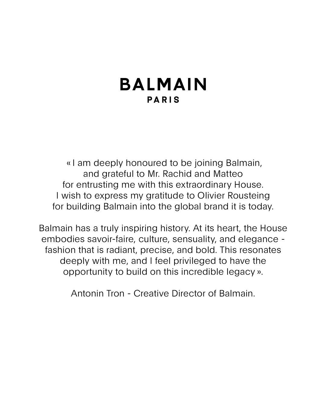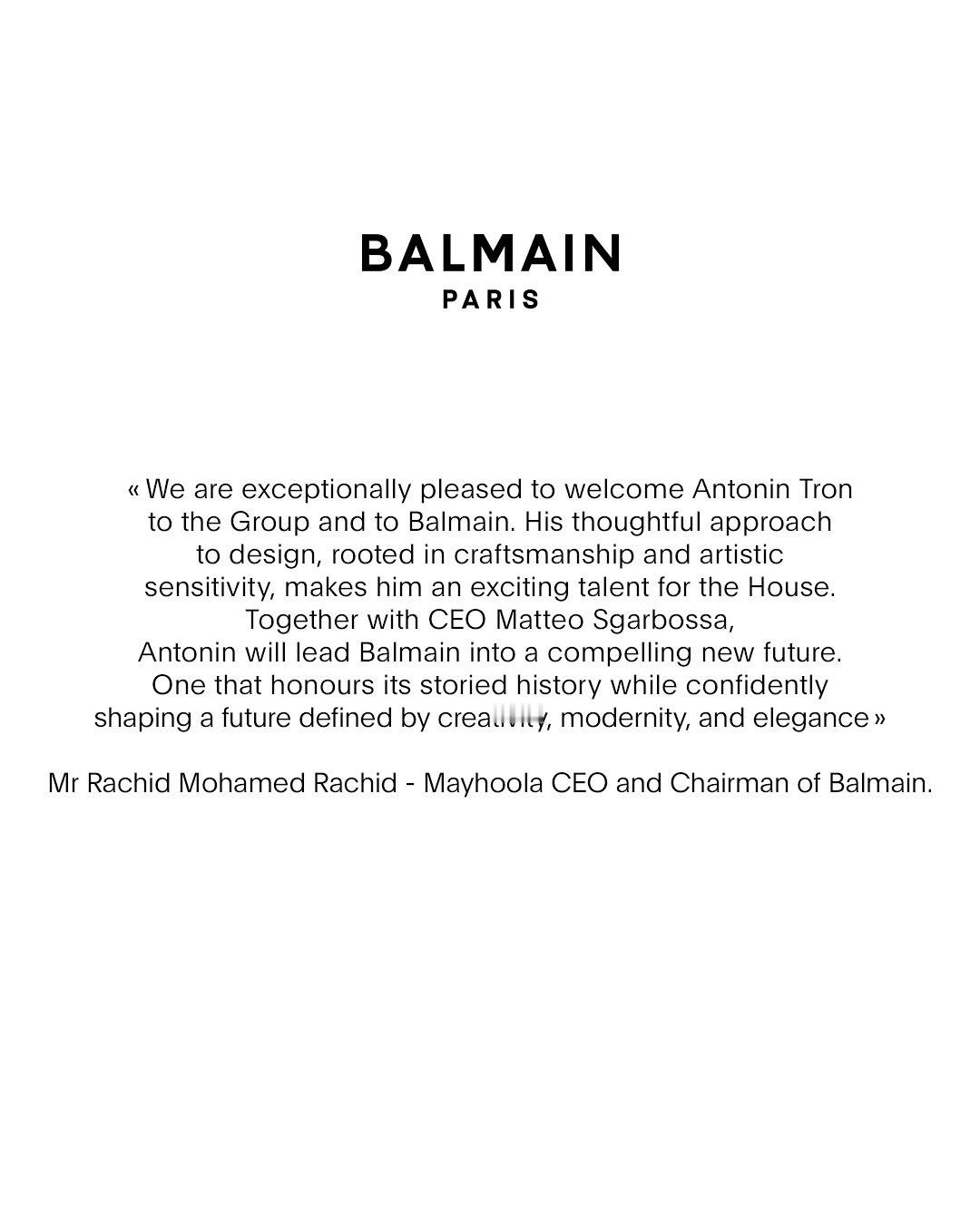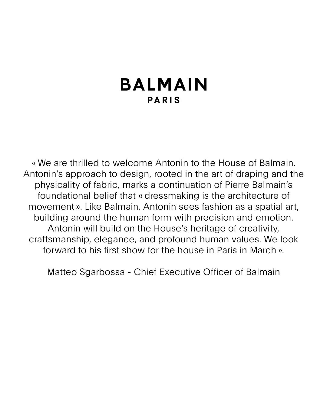 Balmain 官宣 Antonin Tron 成为品牌新任创意总监,这速度也挺快! 现年 41 岁的 Antonin Tron是巴黎独立品牌 Atlein 的创始人兼设计师,以对针织面料的雕塑式褶裥与身体感设计闻名。Antonin Tron 将在 2026 年秋季巴黎时装周呈现其为 Balmain 打造的首个系列。他表示:“Balmain 的灵魂在于精湛工艺、文化底蕴、感性与优雅,这与我深有共鸣。我十分荣幸能在这一传奇之上继续创造。” Balmain首席执行官 Matteo Sgarbossa 表示:“Antonin 在设计中对褶裥与布料动态的掌握,延续了创始人 Pierre Balmain 所信奉的理念——‘服装是运动的建筑’。” 同时,品牌母公司 Mayhoola 集团 CEO 兼 Balmain 主席 Rachid Mohamed Rachid 补充道:“我们非常高兴欢迎 Antonin Tron 加入,他对工艺与艺术的敏锐理解,将为 Balmain 带来全新的创造力。”