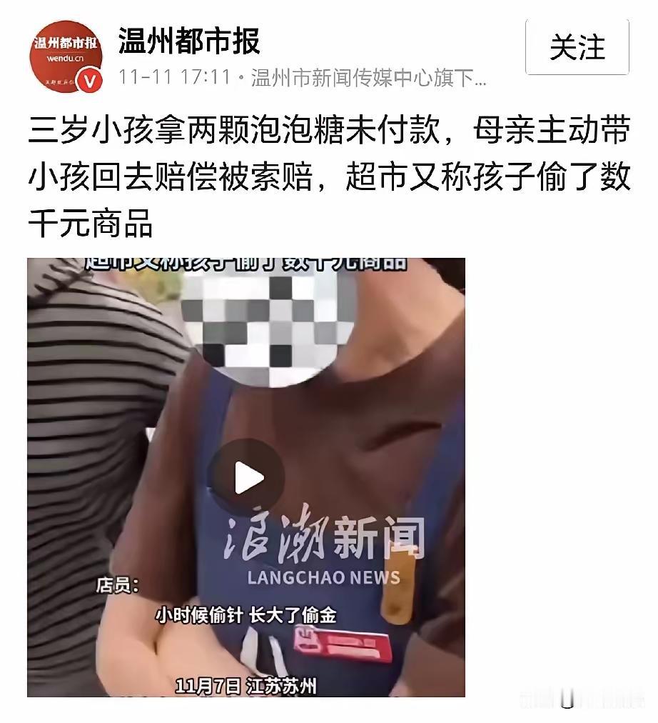 这起事件反映出多个值得关注的问题,也揭示了商家、家长和社会在处理类似未成年人侵害事件时可能出现的误区。 核心要点总结: 3岁儿童的法律责任:根据法律规定,3岁的孩子属于无民事行为能力人,不能承担法律责任。由此,商家指控其“偷窃几千元商品”没有法律依据。公安、法院等相关司法机构都明确,不满14周岁的未成年人在没有造成实际损害的情况下,不应由其承担民事责任。 商家的行为是否合法合理: 索赔金额:超市要求按60元小票付款,远超泡泡糖的实际价值,这是不合理的索赔金额,涉嫌过度索赔。 指控未持证据:没有提供监控录像或其他有效证据证明孩子多次盗窃,属于无据指控,可能侵犯孩子及家长的名誉权。 “偷针长大偷金”言论:工作人员的言语带有侮辱性,不仅不专业,还可能涉及诽谤。 家长的应对措施: 发现孩子拿了东西,第一时间主动归还并赔偿,这是正确的做法。 反应理性,没有当场争执或带有过激言辞,体现负责任的监护态度。 公众反应和法律建议: 法律依据:据《民法典》及最高法院解释,无民事行为能力人不承担民事责任。商家要求赔偿超出泡泡糖价值的金额,没有法律依据。 维权途径:家长有权要求商家提供证据(如监控录像),若无证据,商家应停止指控并承担责任。 言辞和行为:商家应以诚信、合法、公平的原则处理纠纷,避免伤害未成年人及家长的权益。 总结建议: 商家应遵守法律规定,不得无证据指控未成年人盗窃。 家长应理性应对,主动教育孩子,并依法维护自身权益。 社会应加强对未成年人权益的保护,推动文明、理性的商业环境。 如果遇到类似情况,建议: 保留好证据(视频、购物小票等)。 依法与商家沟通,必要时寻求法律帮助。 提倡合理、文明的解决方式,共建和谐社会环境。未成年人遭欺凌