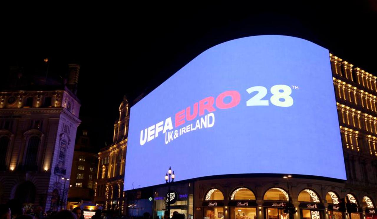 2028年欧洲杯赛事品牌在伦敦发布 2028年欧洲杯的比赛日程于周三公布——共有24支球队在31天内进行51场比赛——同时,赛事品牌也在当地时间晚上8点28分,在伦敦标志性的皮卡迪利广场中心的巨型皮卡迪利灯光屏幕上以壮观的方式向球迷们揭晓。 与此同时,在英国和爱尔兰各地,新的标志以及主办城市的标志在当地活动中展出,包括在著名地标上进行灯光投影以及在市中心的数字屏幕上进行展示。 该品牌的核心是2028年欧洲杯的标志,标志上饰有标志性的亨利·德劳内奖杯,其动感的设计捕捉了节日的气氛和人与人之间的联系,并以东道主国家的鲜艳色彩加以点缀。这一品牌标识强化了“足球是连接世界的语言”这一理念。