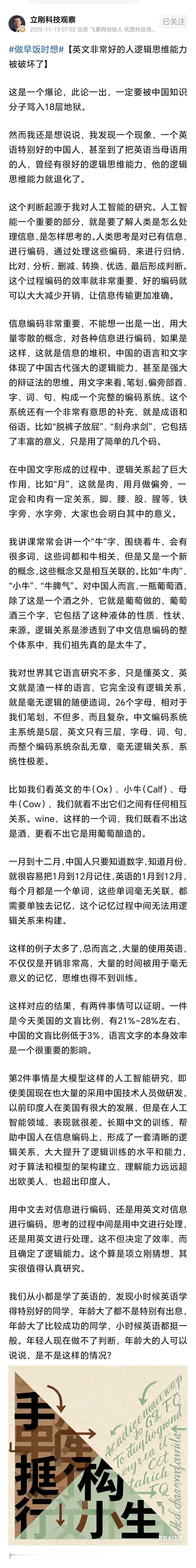 学英语会不会破坏逻辑思维能力,目前尚无定论。 但中国的语文和文字肯定是这个星球上