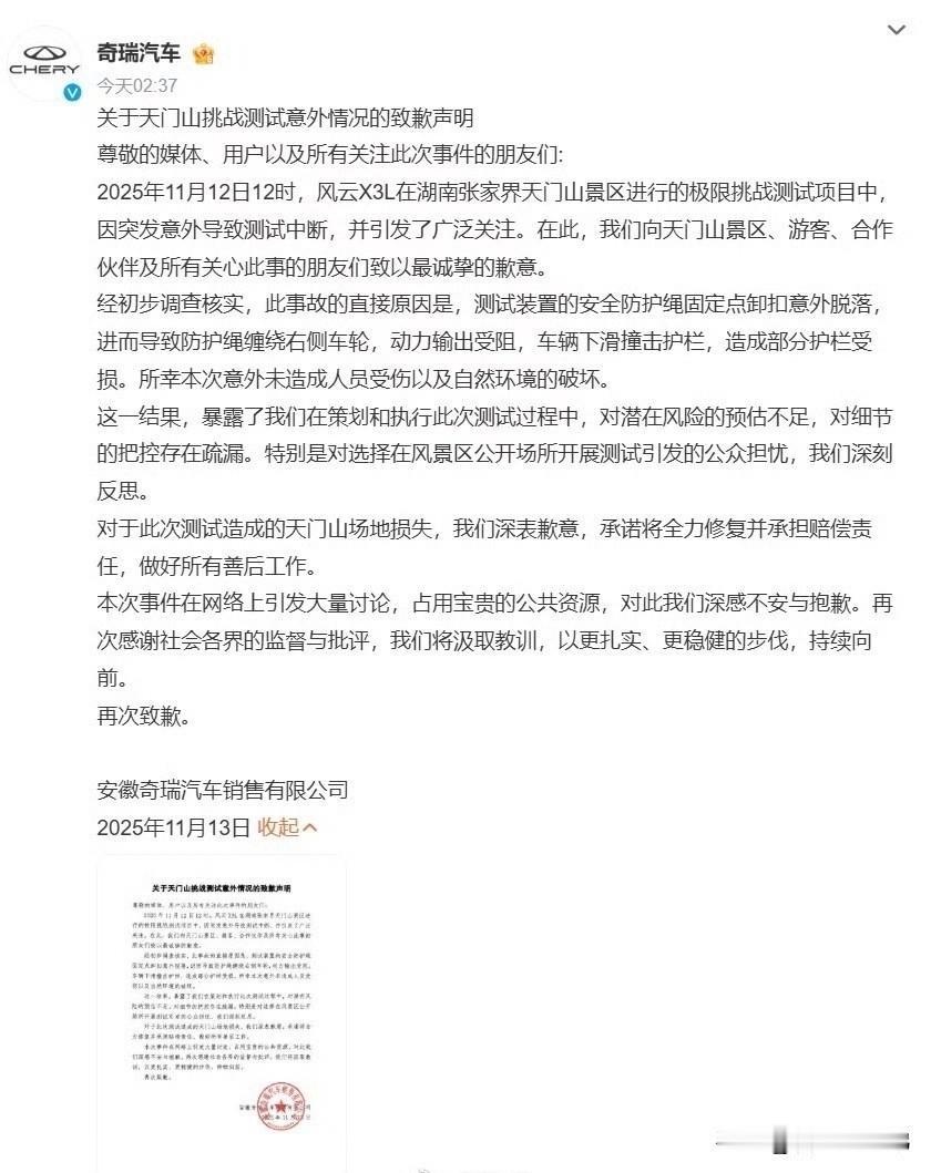 冬日生活打卡季奇瑞致歉关于张家界天门山测试意外的官方说明:经初步调查核实,本次车