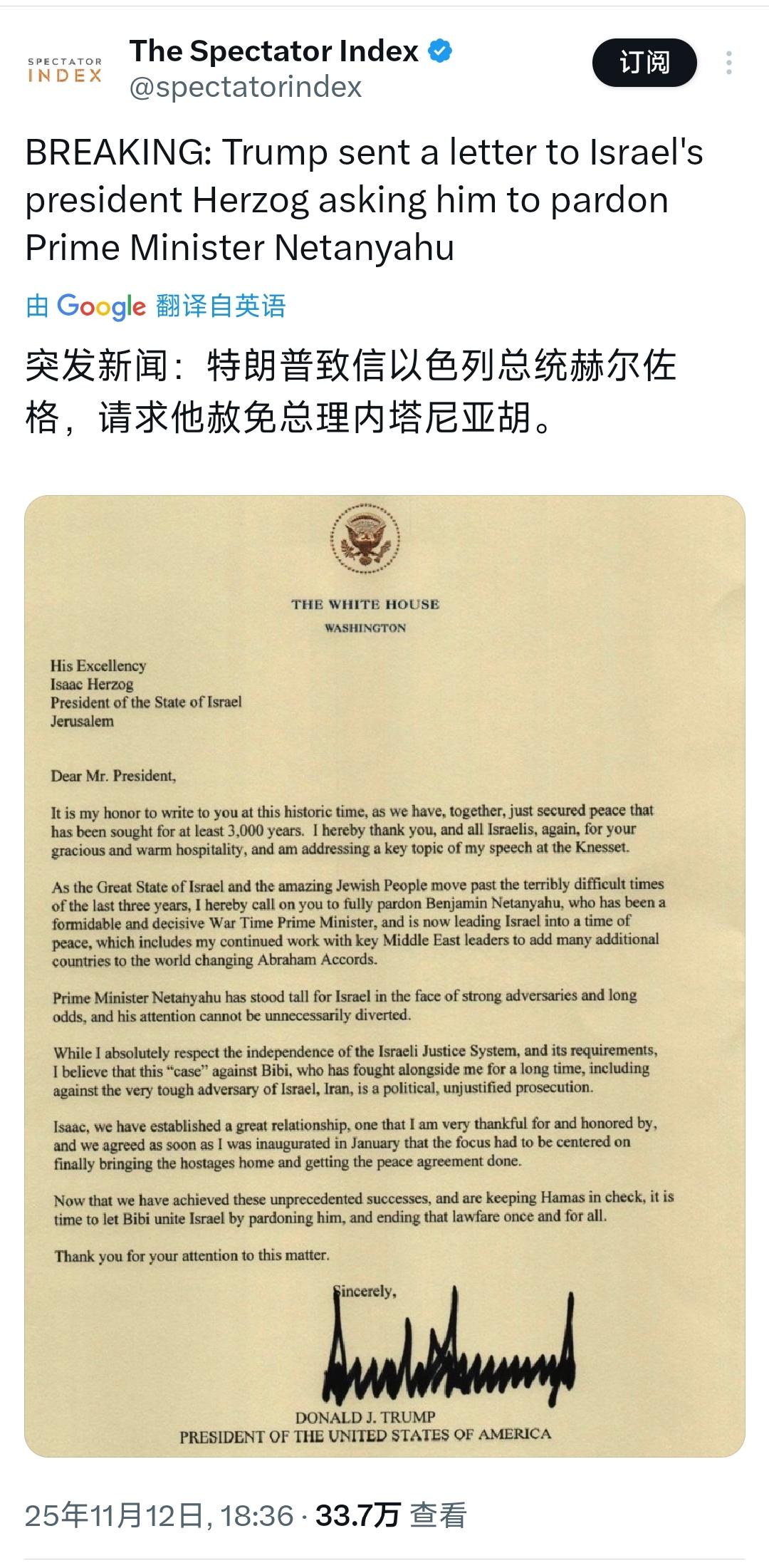 特朗普(北京时间11月12日晚)向以色列总统赫尔佐格发去一封正式信函,请求他赦免