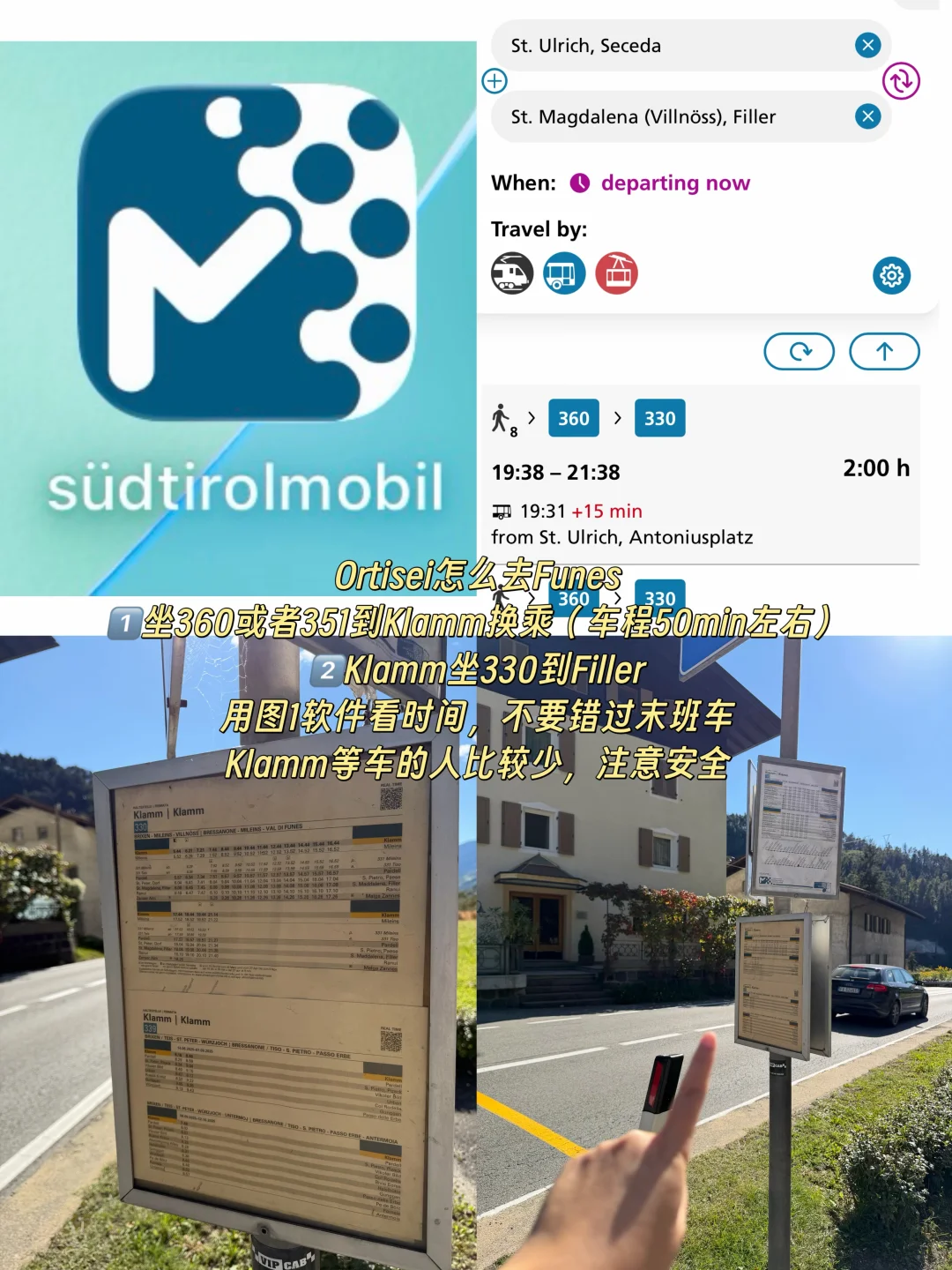 见图4: 从Ortisei小镇坐360/351到Klamm,换乘330抵达富内斯山谷(Filler),车程1.5小时起,末班车19:12,用图4的地图看时间