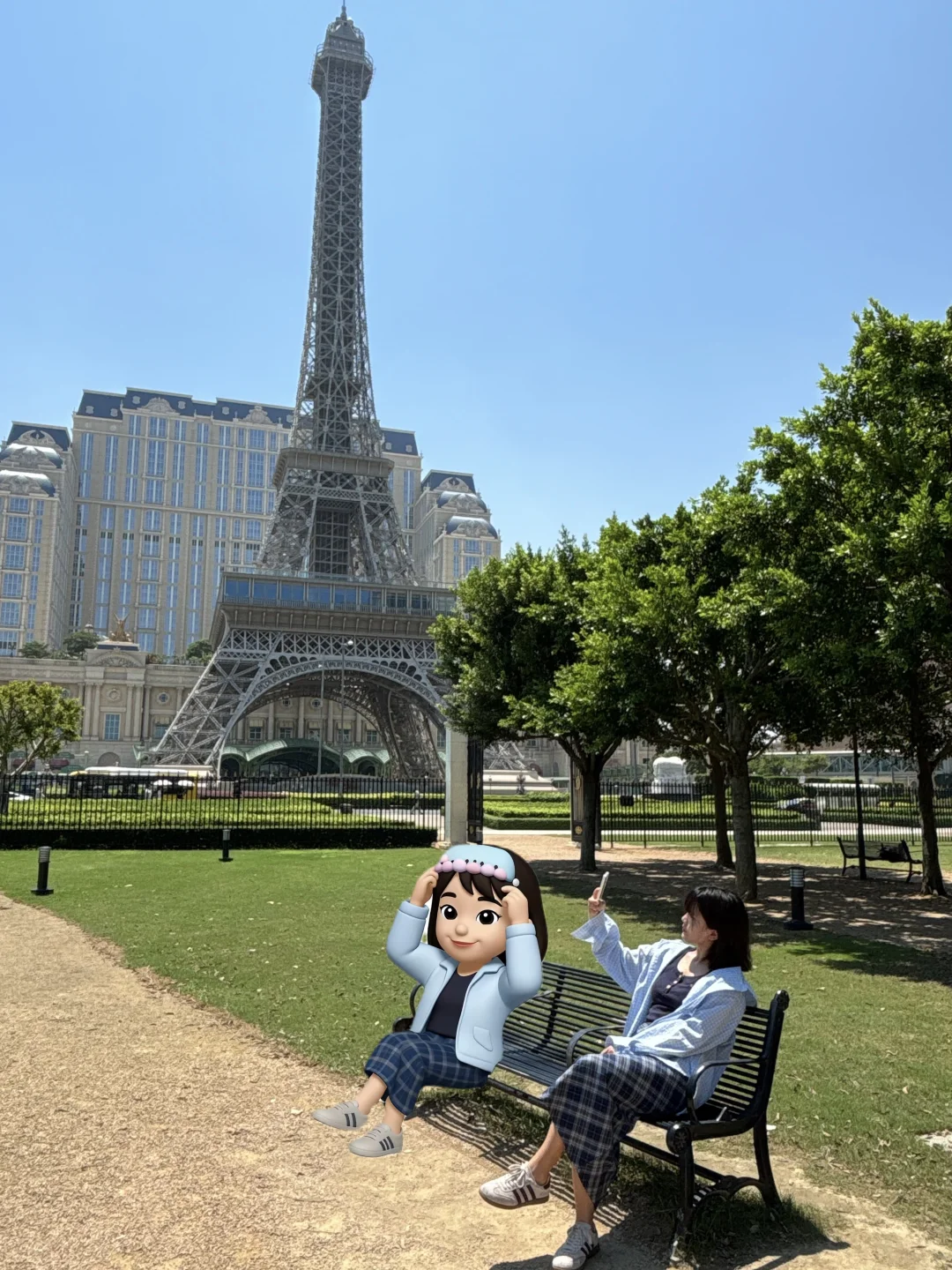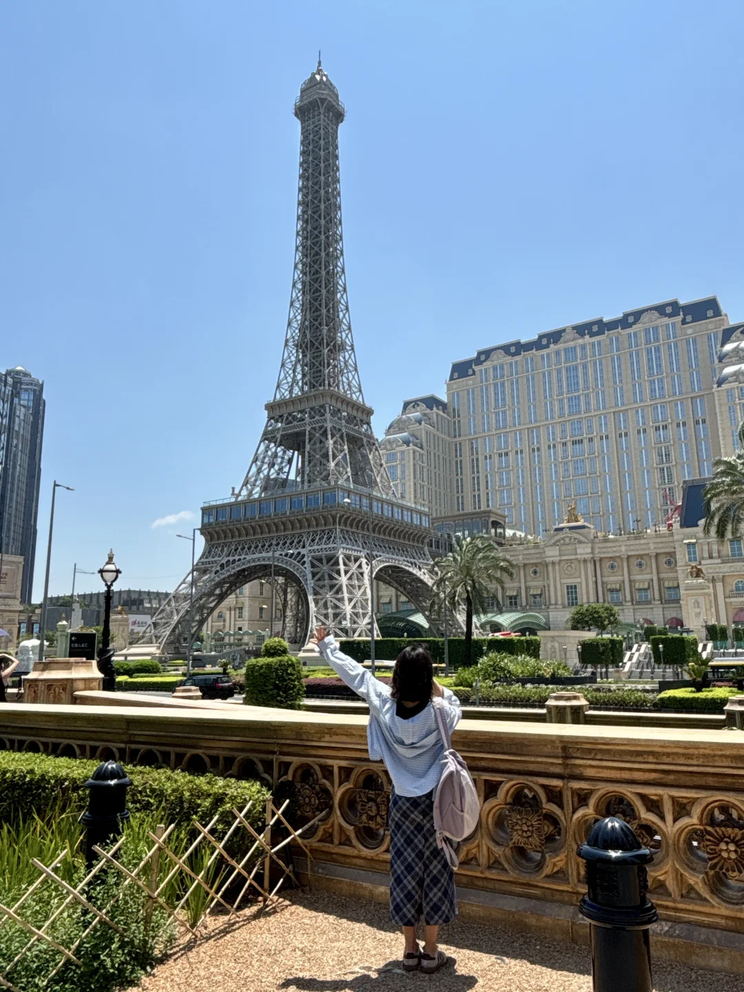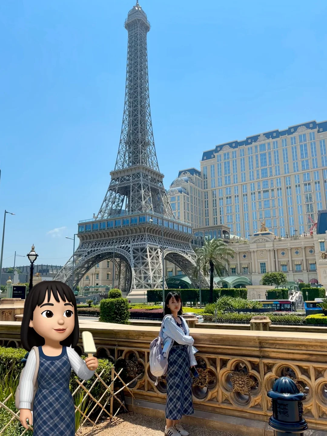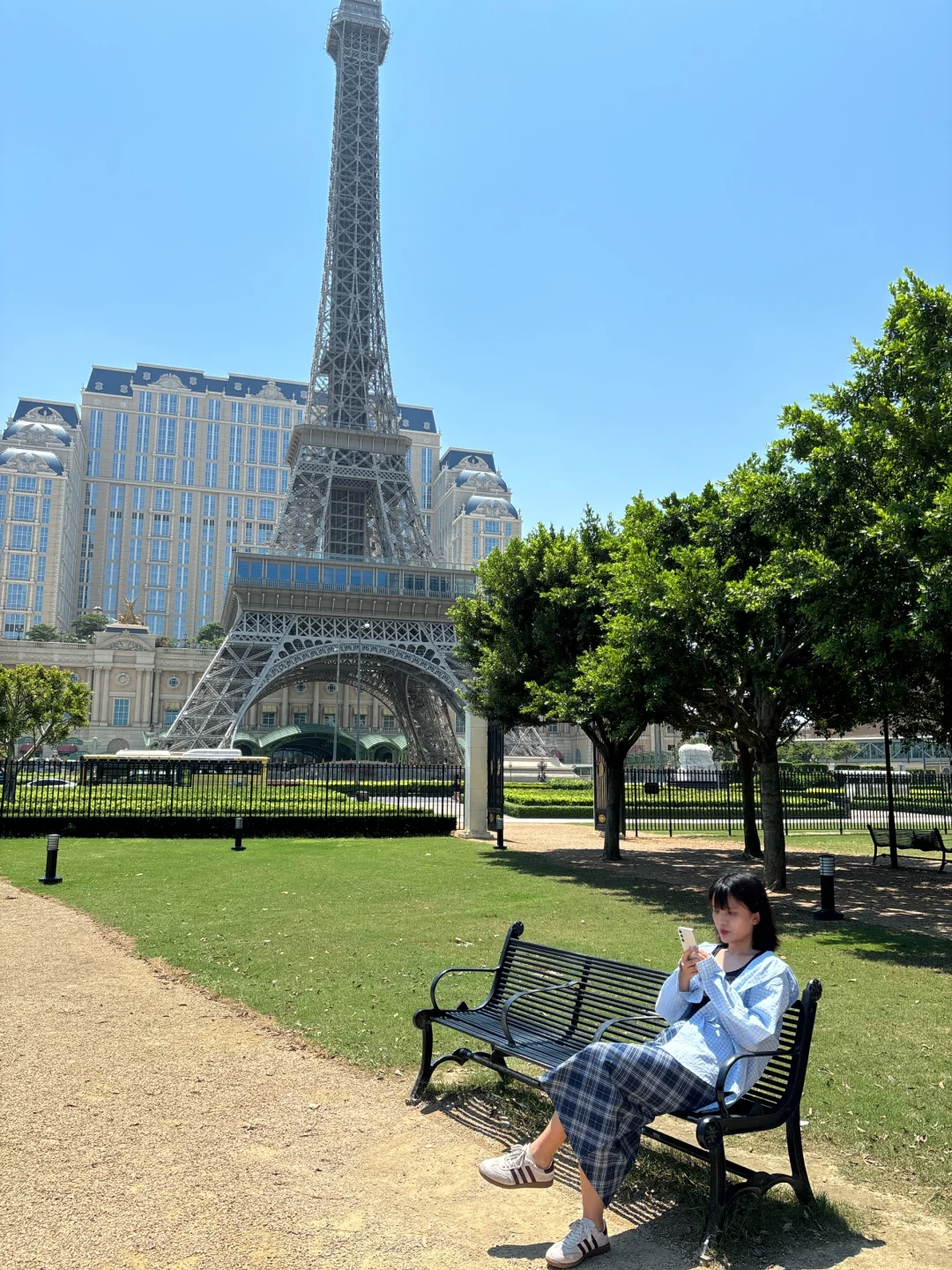 从官也街步行15分钟到巴黎人(有传送带),从伦敦人拍对面的铁塔位置Z好,旁边还有公园,可以拍到草坪和椅子,非常出片,公园的树荫下也比较凉快🌳