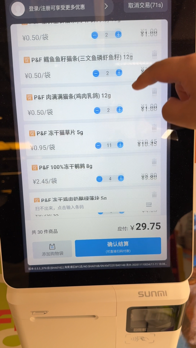 记者当日也购买了冻干、猫条、鹌鹑等猫零食三十余袋,总计不足30元。