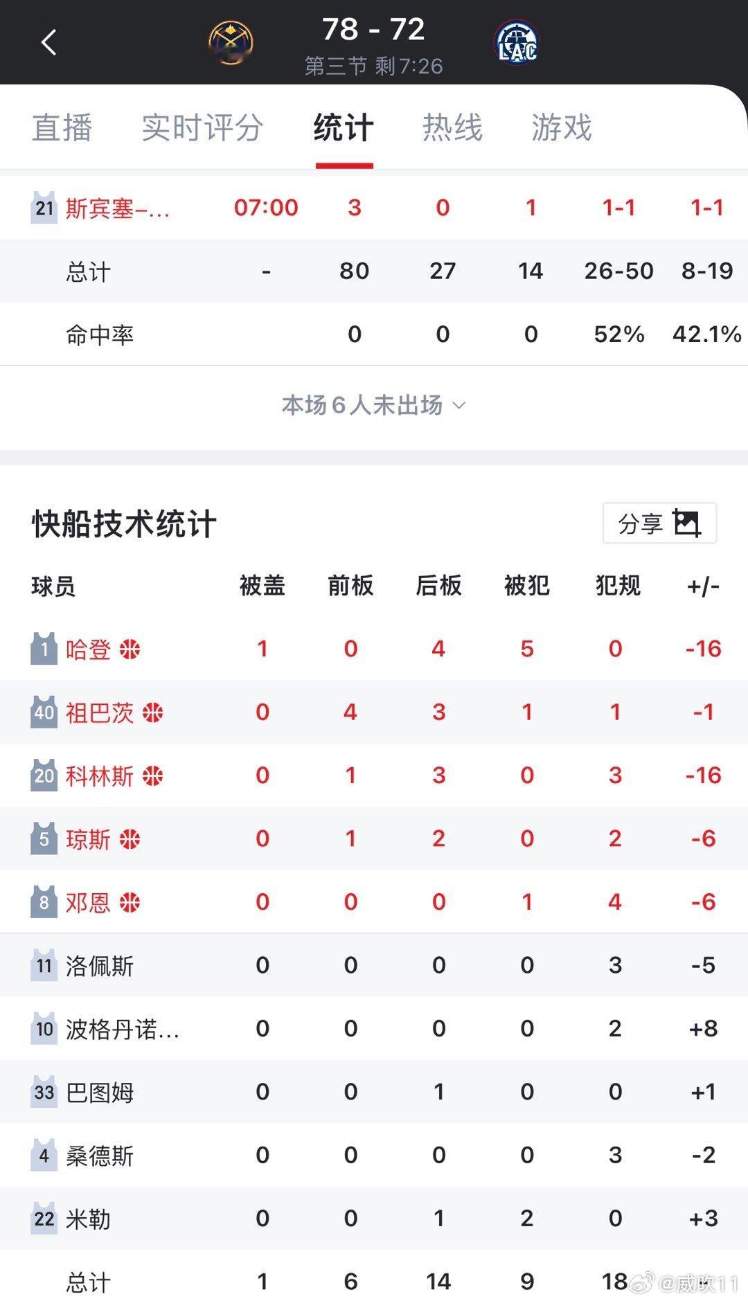 约老师和掘金首发都回来了,但祖巴茨和四个替补在扩大分差,正负值➕11