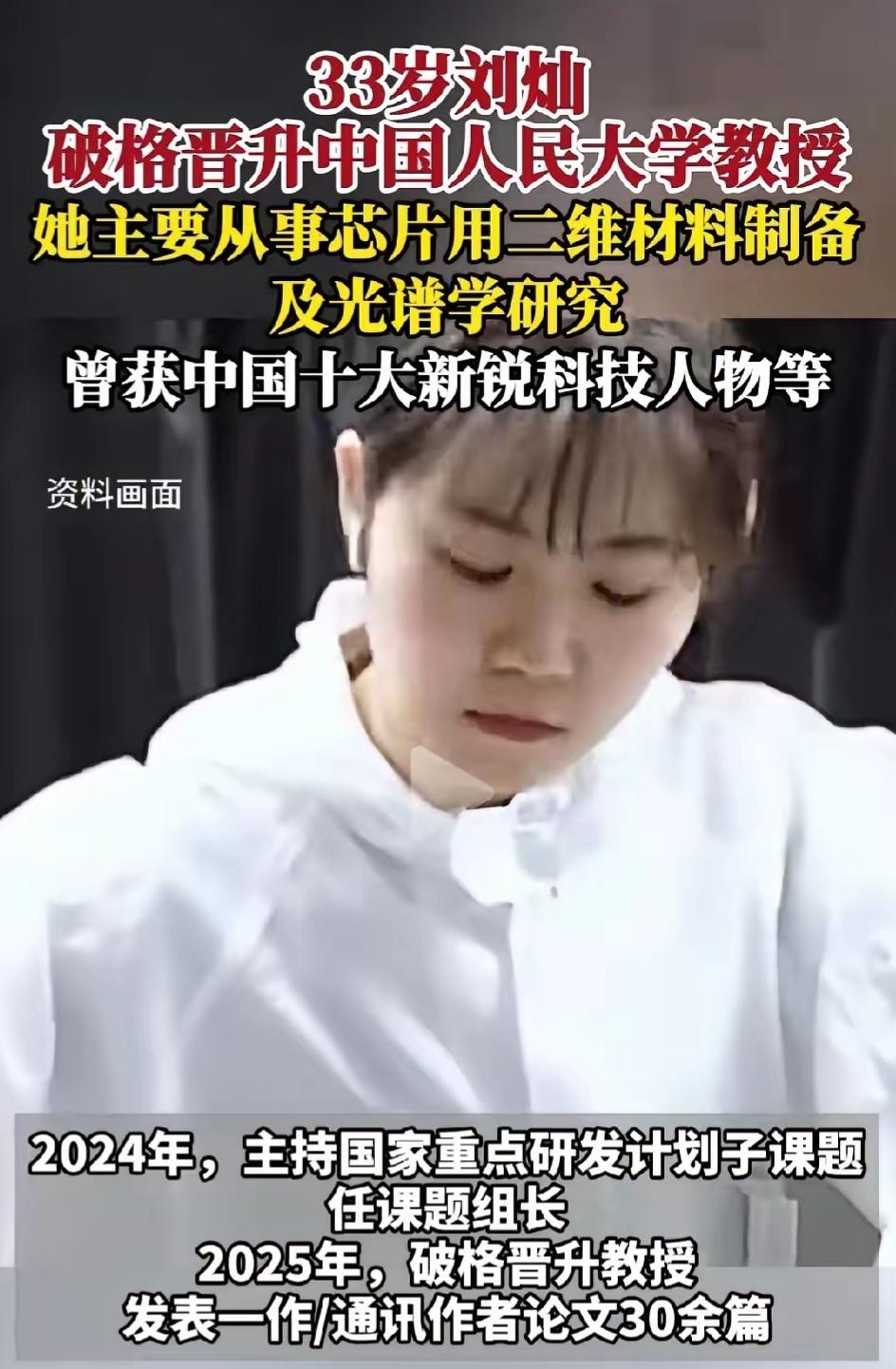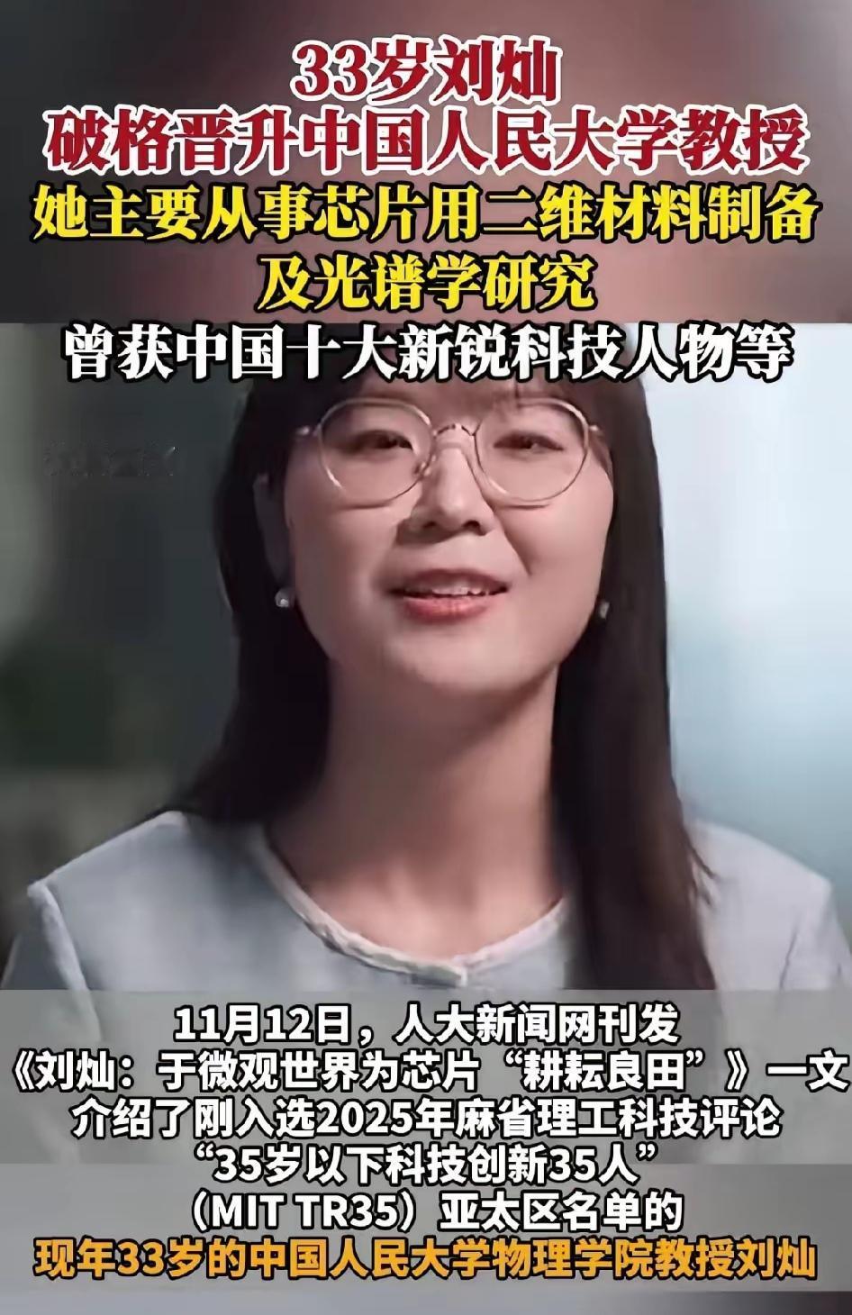 打破摩尔定律,推动芯片从平面走向二维,33岁的她,被破格晋升为教授! 传统芯片发展的物理边界逐渐显现,全球半导体产业遭遇技术瓶颈,33岁的中国女性青年科学家刘灿,以逆向创新思路开辟新径,凭借二维纳米材料领域的突破性研究,正在为行业破局。最近,刘灿被中国人民大学破格晋升,聘为正教授,跻身于该校青年学术领军者行列。 芯片作为现代科技产业的核心基石,传统架构已接近性能上限,探寻性能更优的替代材料,成为全球科技竞争的核心赛道。二维材料,则被公认为后摩尔时代芯片的核心方案,但如何规模化制备高纯度、大面积的二维晶圆,长期以来是困扰全球科研界的技术难题。 刘灿团队突破传统材料的思维定式,独创全新技术路径,实现了二维材料的高效生长,取得关键性突破。她的这一创新成果,不仅攻克了行业长期面临的技术壁垒,更为芯片从传统平面架构向二维立体架构的转型,提供了核心技术支撑。 从事科研工作短短数年,刘灿发表了30余篇顶尖学术论文,申请了16项具有自主知识产权的发明专利,在全球二维材料研究领域,树立起重要学术影响力。她的学术成果得到广泛国际认可,相关技术也具备很好的产业转化价值。 刘灿完全是国内大学培养出来的顶尖人才,她的学术成长轨迹,充分展现了我国创新人才培养体系的实践成效。中国人民大学近年来,加大了理工科的建设投入,在物理与材料科学领域搭建高水平科研平台,为青年学者提供了广阔的学术发展空间。 在芯片核心技术面临外部制约的行业背景下,刘灿的技术突破,不仅为我国在前沿材料领域赢得了国际话语权,更向全球贡献了芯片技术升级的中国方案。 33岁的破格晋升,既是对刘灿科研成就的高度认可,更是我国鼓励青年科学家勇闯技术“无人区”的生动缩影。 随着二维材料技术逐步走向产业化应用,这场芯片领域的“维度革新”,必将为人工智能、物联网、5G通信等新兴产业,注入强劲发展动能,助力我国在全球科技竞争格局中,占据更主动的战略地位。 半导体风云人物 半导体产业革新 芯片工艺极限 半导体发展规律 生物芯片技术 半导体技术革新