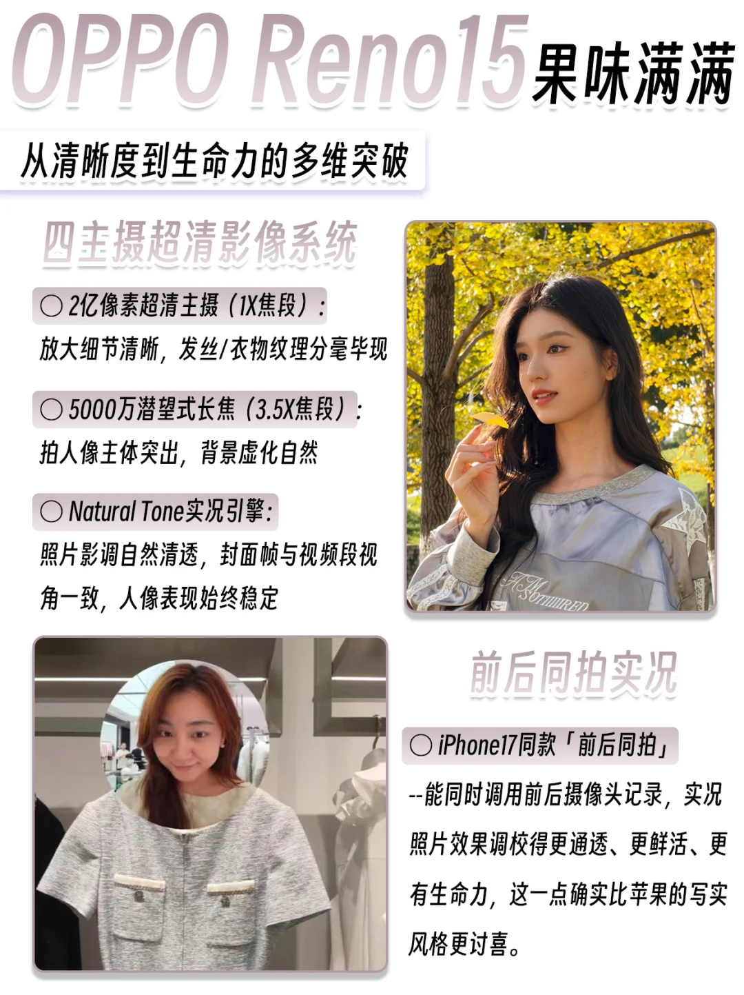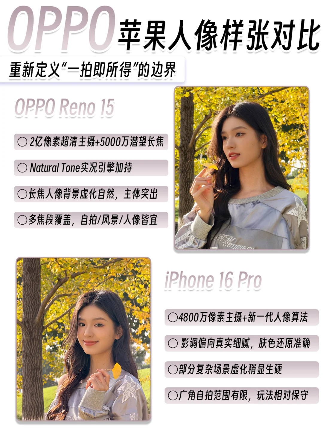 而且对于人像图来说OPPO Reno15在NaturalTone实况引擎加持下,人物的细节会更有质感,而且长焦人像背景虚化自然,主体突出!让画面更好!iPhone影调偏向真实细腻,肤色还原准确,但涂抹感还是比较强,部分复杂场景虚化稍显生硬,这一点还是比较可惜